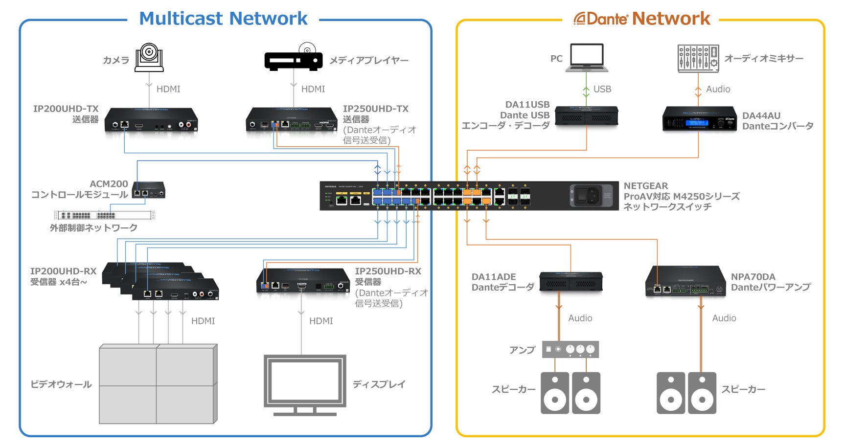 双方を組み合わせることにより、コンサート会場、スポーツイベント、デジタルサイネージ、会議室、教育施設、医療現場など、既存または新規のDanteオーディオネットワークシステムと映像伝送システムを同時に構築する場合に最適なソリューションを提供いたします。