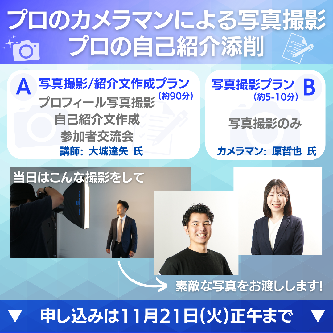 そこで今回、皆様がアルムナイネットワークやSNS上で新しいつながりを作るきっかけ作りとして、プロカメラマンと講師の方を招いたプロフィール写真撮影&自己紹介文充実イベントを無料で実施します。
