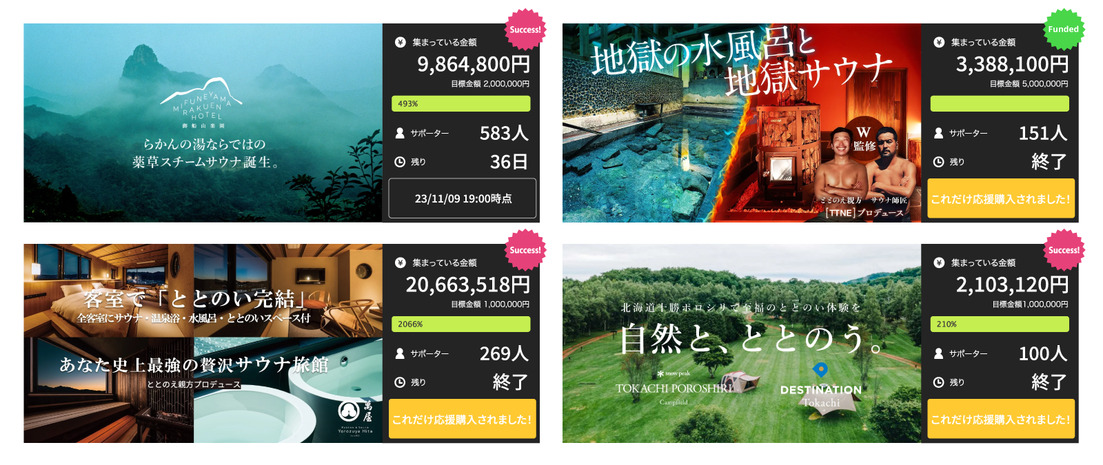 これまでに「SAUNACHELIN(サウナシュラン)」で唯一の殿堂入りを果たした佐賀県のサウナ施設「らかんの湯(※2)」が新たな薬草スチームサウナオープンに向けてMakuakeを実施し900万円を超える応援購入総額を集め、現在もプロジェクトを進行中です。また、大分の老舗旅館「萬屋(※3)」が「サウナ旅館」へのリニューアルに向けて「Makuake」でプロジェクトを実施し、2,000万円超の応援購入総額を集めるなど、地方の実行者による「Makuake」活用が増加し、サポーターから注目を集めています。