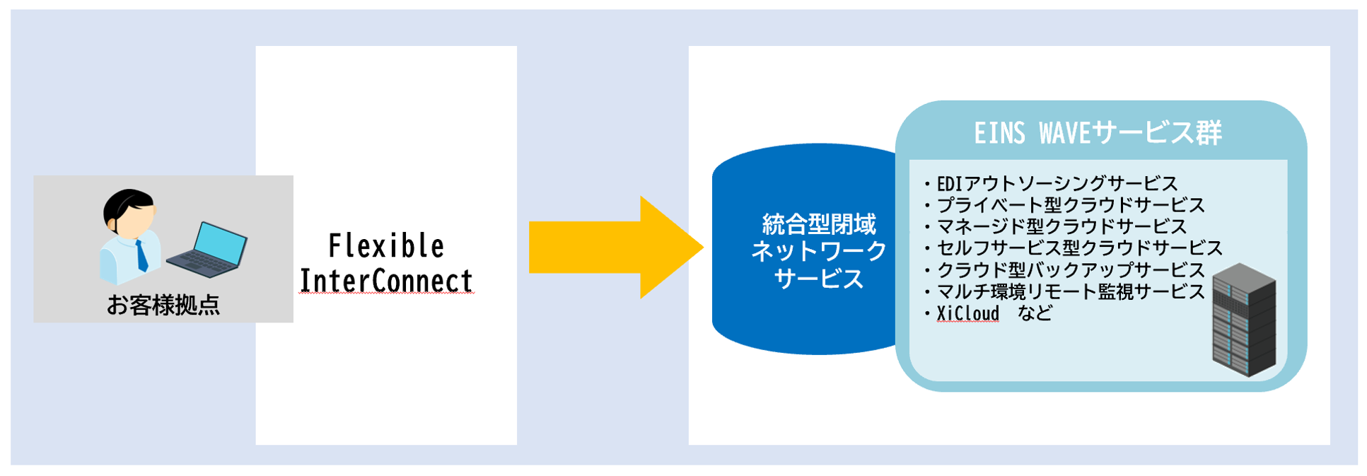 「FIC」と「EINS WAVE」を「統合型閉域ネットワークサービス」で連携することで、「FIC」をご利用中のお客様は、新たに専用のサービス利用回線を用意することなく、容易に「EINS WAVE」の各種対応サービスを閉域の環境で利用することができます。
