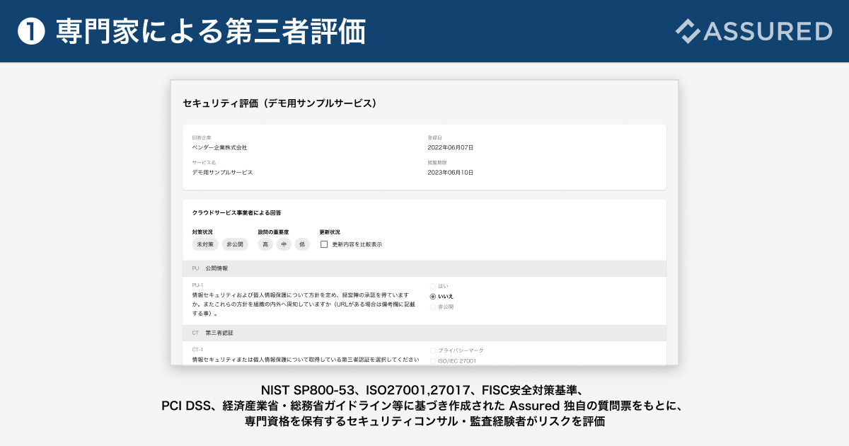 Assuredは、ISO/IEC27001、ISO/IEC27017、NIST SP800-53をはじめ、主要なフレームワークや経済産業省・総務省のガイドラインに基づいたフォーマットに沿って回答した内容をセキュリティの有資格者が情報の確からしさを確認した後に情報登録される仕組みのため、自社の公開情報と併せることで、より網羅的なセキュリティ情報を顧客に提供可能です。
