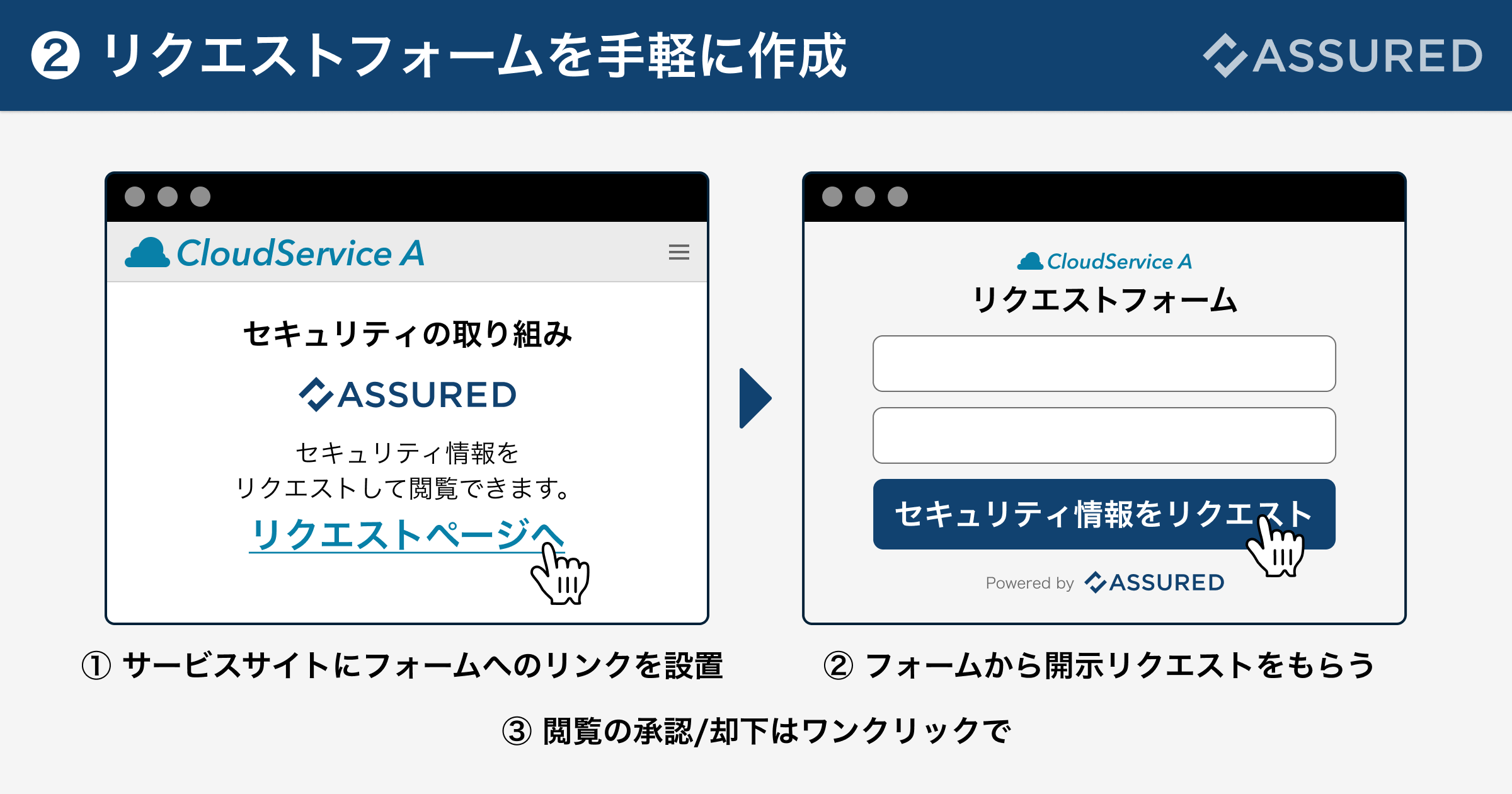 Assuredを活用することでセキュリティ情報の開示を外部から受け付けるリクエストフォームの発行ができ、自社サービスサイトへの掲載が可能です。そのため、開示したい取引先企業にのみ、より詳細なセキュリティ情報を提供できるため取引先に対してより安心いただいたうえでサービスの利用を開始・継続いただくことができます。