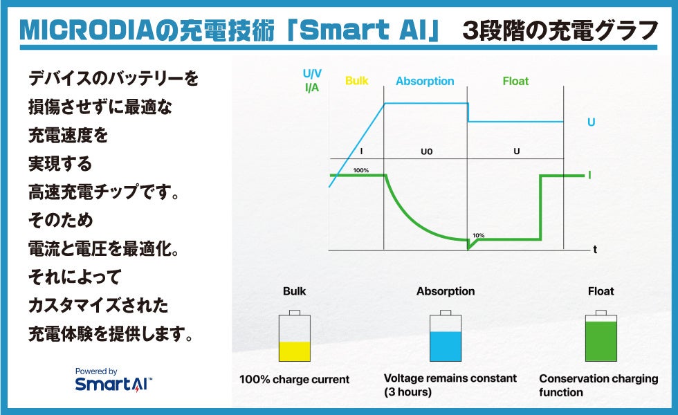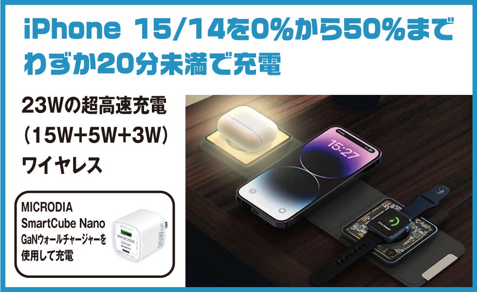 この折りたたみ式充電ステーションは、iPhone(15W)、Apple Watch(5W)、AirPods(3W)向けに合計23Wの高出力充電が可能です。そのため、iPhoneを0%から50%まで充電するのにわずか20分未満**(MICRODIA SmartCube GaNウォールチャージャーを使用して充電)。