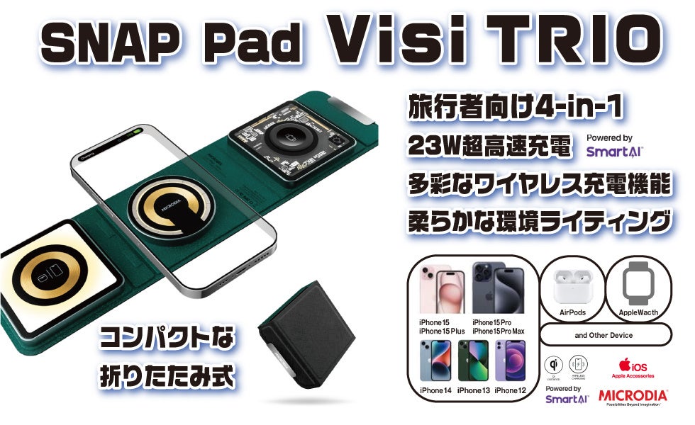 SnapPad Visi-TRIOは、iPhone、Apple Watch、AirPodsなど複数のデバイスを効率的に充電できる23Wの4-in-1折りたたみ式ワイヤレス充電ステーションです。