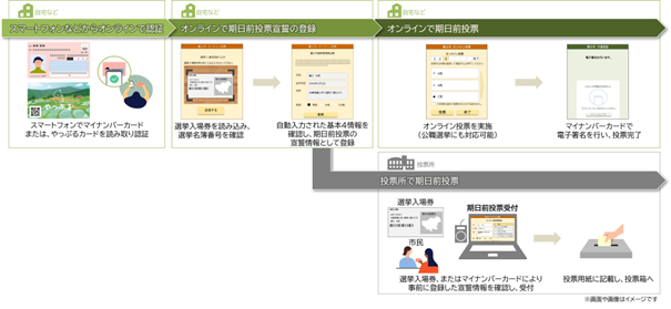 マイナンバーカードの個人認証機能などを活用し、市民が自宅で本人確認の上スマートフォンなどからオンラインで期日前投票宣誓や期日前投票ができる仕組み*7を、日立がスパイラル株式会社*8とともに開発します。これにより、時間や場所にとらわれないオンライン投票選挙の実現をめざします。
