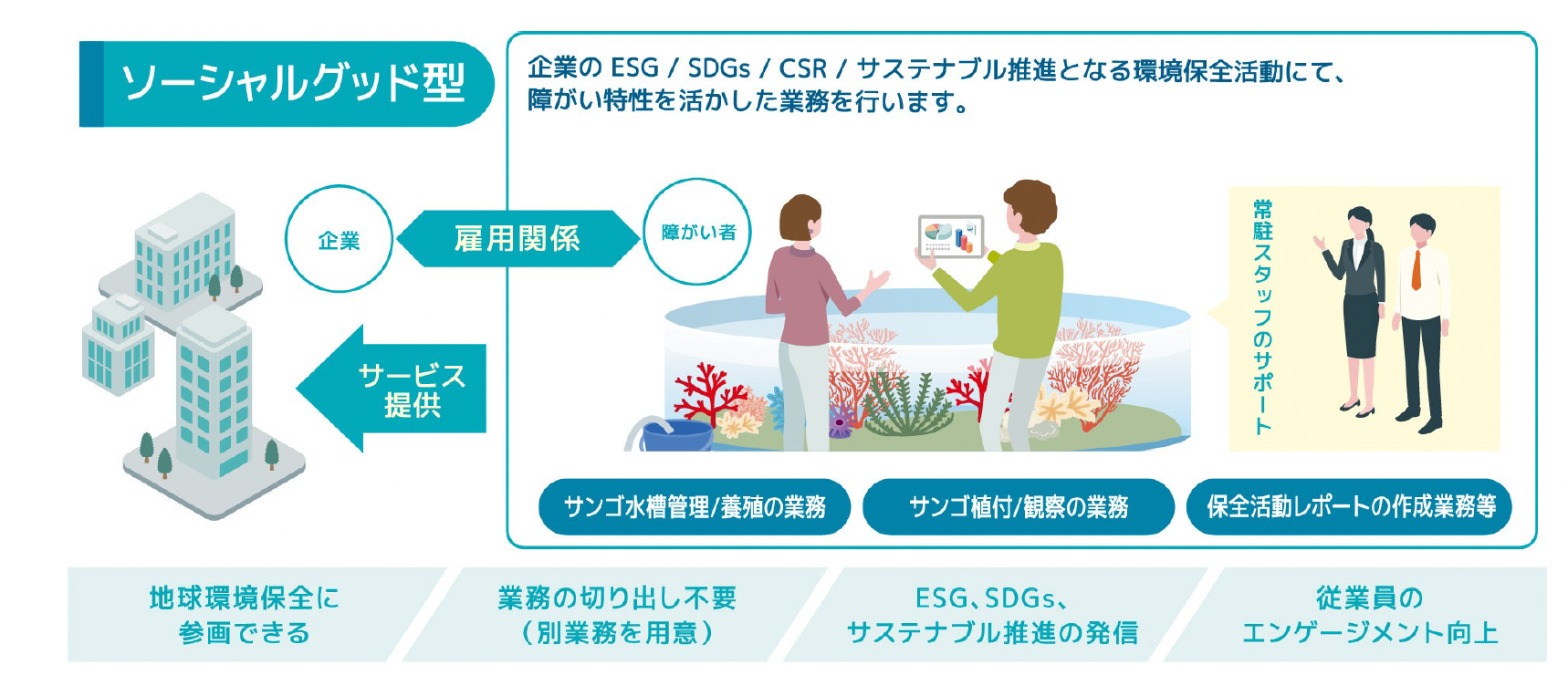 企業の障がい者雇用の課題をサテライト・テレワークの雇用にて、安心 / 低コスト / ワンストップにて解決し、業務の成果につなげる、障がい者雇用の支援サービスを 提供しています。「ソーシャルグッド型」のサンゴ保全業務に加え、デスクワーク (パソコンやタブレットでの業務)に特化した「オフィス型」の障がい者雇用も 積極的に運営しています。