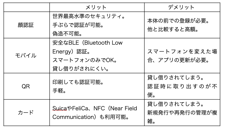 ・顔認証やQR認証、RFID(カード)認証(FeliCa等)を認証方式として選べるので、セキュリティの強度を選択できる。