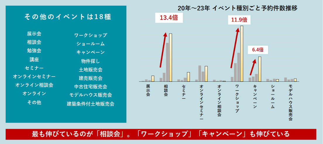 ベントの多くが、完成⾒学会やモデルハウス、展⽰場など見学系でしたが、コロナ禍を経て最近ではセミナーなど「その他」に分類されていた集客イベントの来場予約が増えています。その中でも、特に来場予約率が高いのがワークショップとなっていました。端材を活用したDIYやフラワーアレジメントは低予算での開催が可能であり、作品を持ち帰りインテリアとして楽しむことができる、子どもだけでなく家族で楽しめるなどの理由から高い集客効果を見込めます。