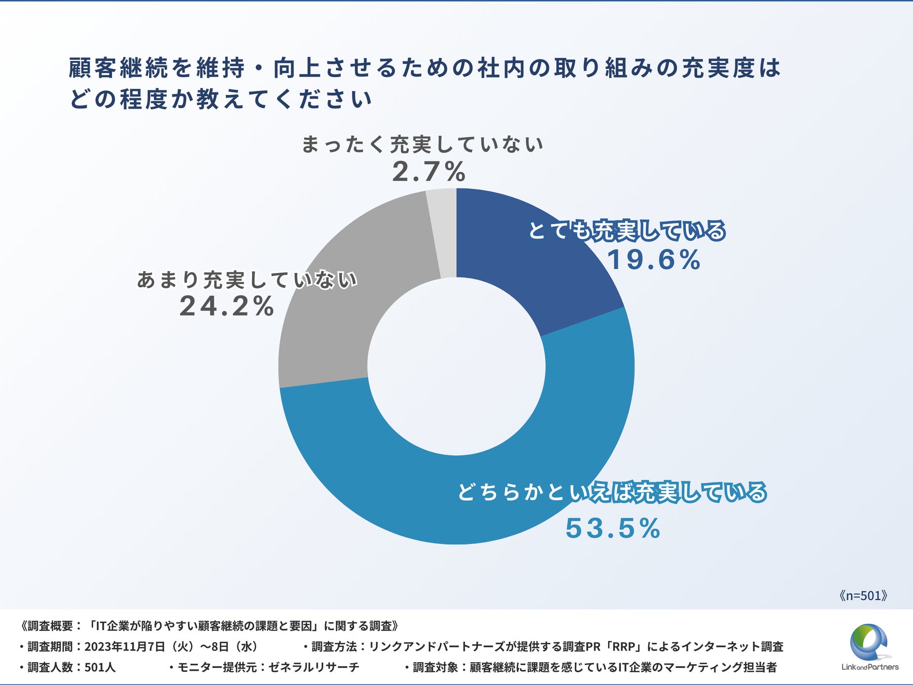 「Q6:顧客継続を維持・向上させるための社内の取り組みの充実度はどの程度か教えてください」と質問したところ、「とても充実している」が19.6%、「どちらかといえば充実している」が53.5%、「あまり充実していない」が24.2%、「まったく充実していない」が「2.7%」という回答になりました。