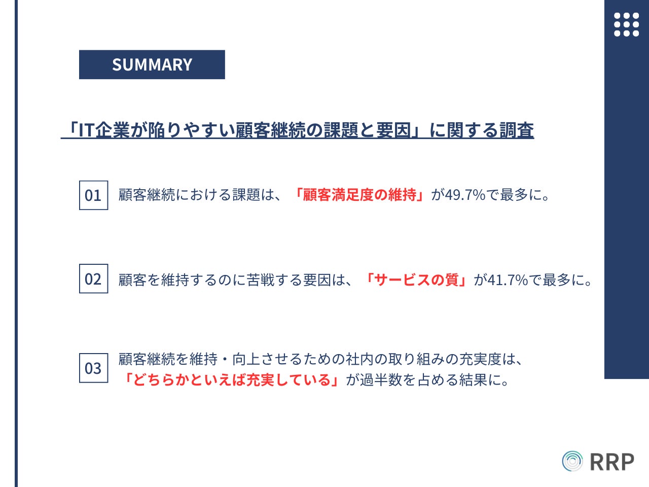 上記の調査結果から、顧客継続における課題は「顧客満足度の維持」が49.7%、顧客を維持するのに苦戦する要因では「サービスの質」が41.7%でそれぞれ最多であり、顧客継続を維持・向上させるための社内の取り組みの充実度では、「どちらかといえば充実している」という回答が過半数を占める結果になりました。