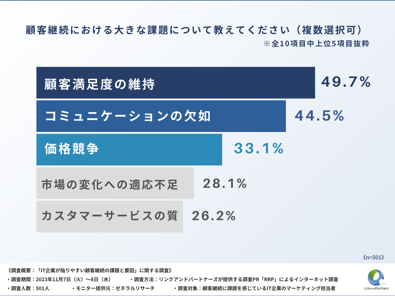そこで、調査PRサービス「RRP(https://service.link-ap.com)」を提供する株式会社リンクアンドパートナーズは、顧客継続に課題を感じているIT企業のマーケティング担当者501名を対象に、「IT企業が陥りやすい顧客継続の課題と要因」に関する調査を実施しました。