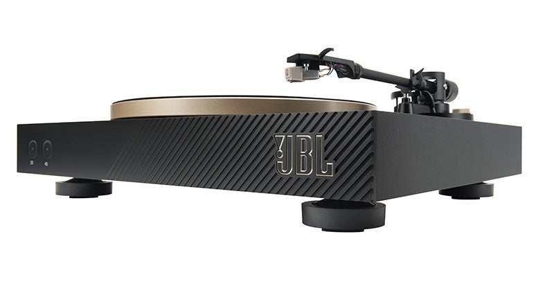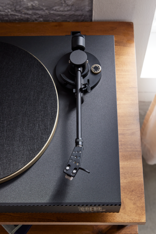 「Spinner BT」は、キャビネットの前面に、エッジにゴールドをあしらったJBLロゴをあつらえ、それにマッチングするように同じくゴールドの塗装が施されたアルミニウム・ダイキャストのプラッターを採用。カートリッジ交換にも対応するアルミニウム製トーンアームを採用した本格的な仕様を施しつつ、リビングのアクセントとなるデザインとしてまとめ上げています。