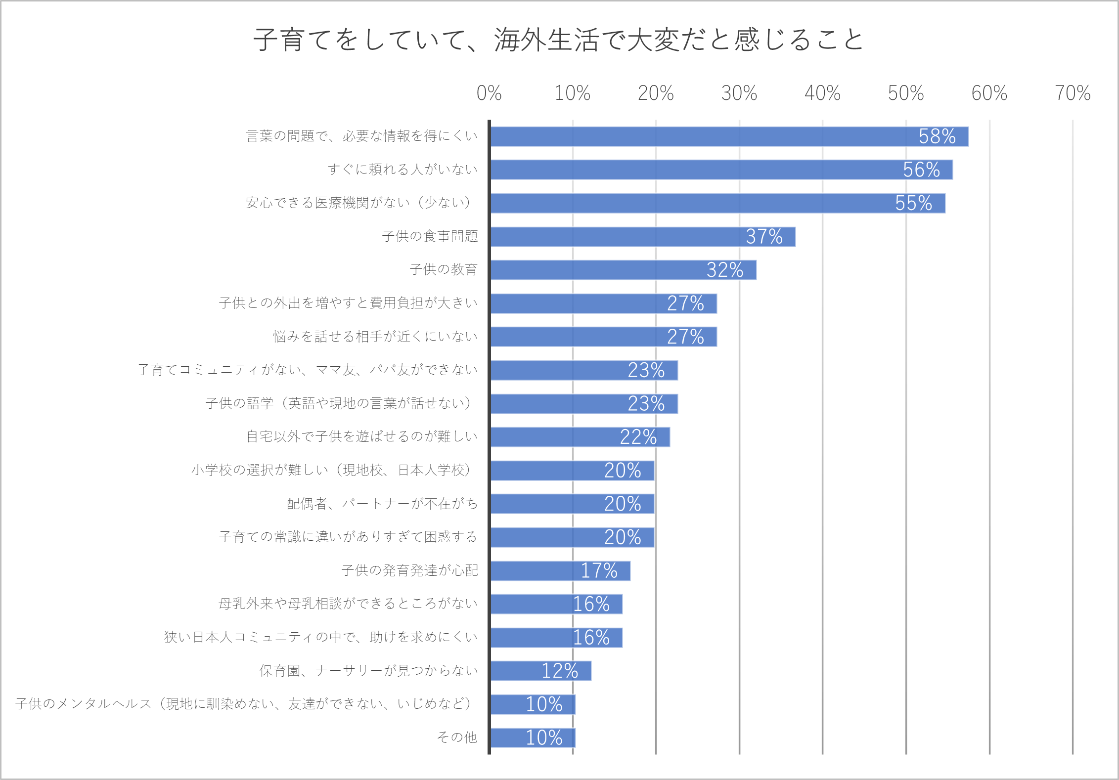 子育ての相談は、配偶者またはパートナー(69%)、親(47%)、兄弟にしているという回答が得られましたが、病院に関しては「日本人同士でも職種や保険で人によって待遇が違うので、情報をもらうのが難しい」など、体調不良などがあった時に頼れる人がいないと感じているようです。