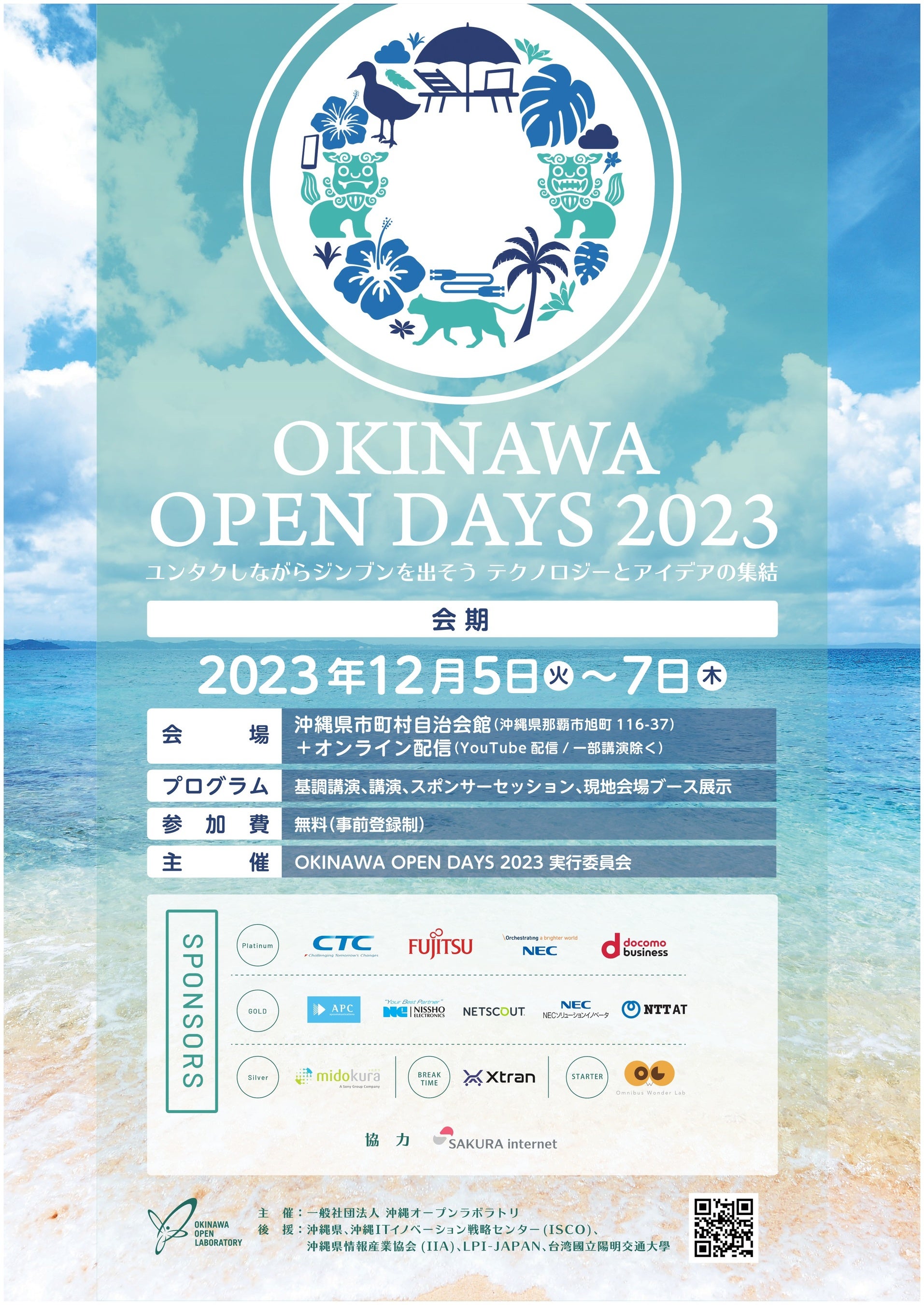 一般社団法人沖縄オープンラボラトリ(本社:沖縄県浦添市、代表理事:伊藤幸夫 以下、OOL)は、「ユンタクしながらジンブンを出そう* テクノロジーとアイデアの集結」をキーコンセプトにした沖縄発・沖縄開催のICTイベント「Okinawa Open Days 2023」を以下の通り開催します。