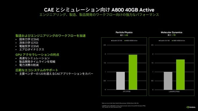 「NVIDIA A800 40GB Active」は、デスクサイド ワークステーションにマルチGPU を利⽤してコンピューティングパフォーマンスを⾼めることによって、AI 学習性能、AI 推論、CSM(個体⼒学)、流体⼒学(CFD)、電磁気学等のCAE のシミュレーションの性能が向上し計算時間を縮めます。