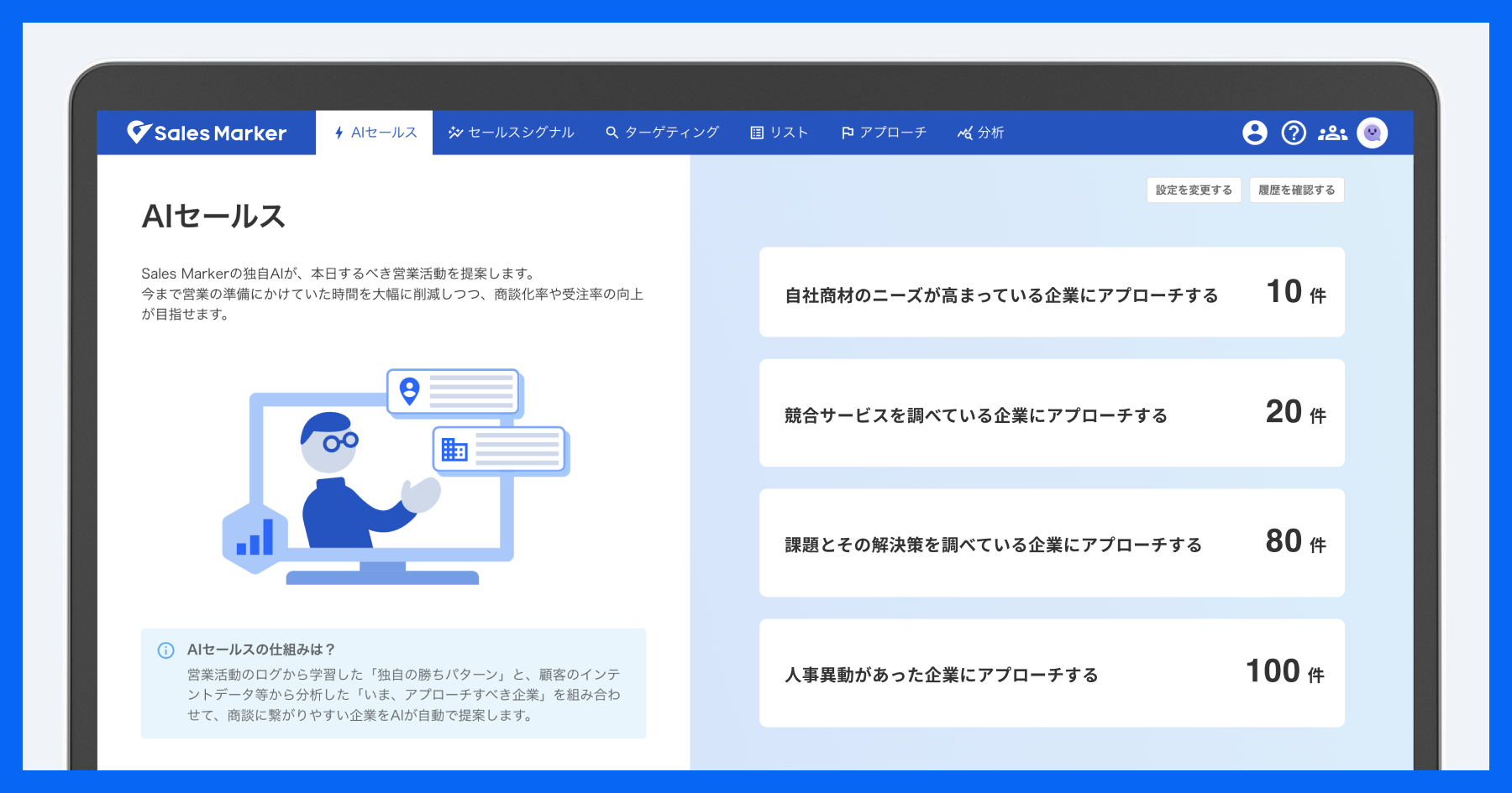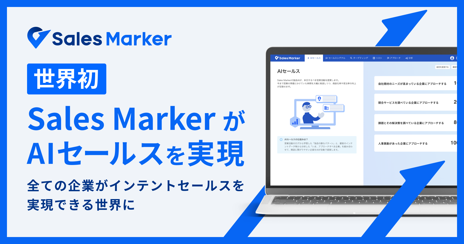 従来トップセールスが試行錯誤しながら行っていたこのようなプロセスの自動化を、「Sales Marker」が独自に開発したAIによって、世界で初めて実現しました。