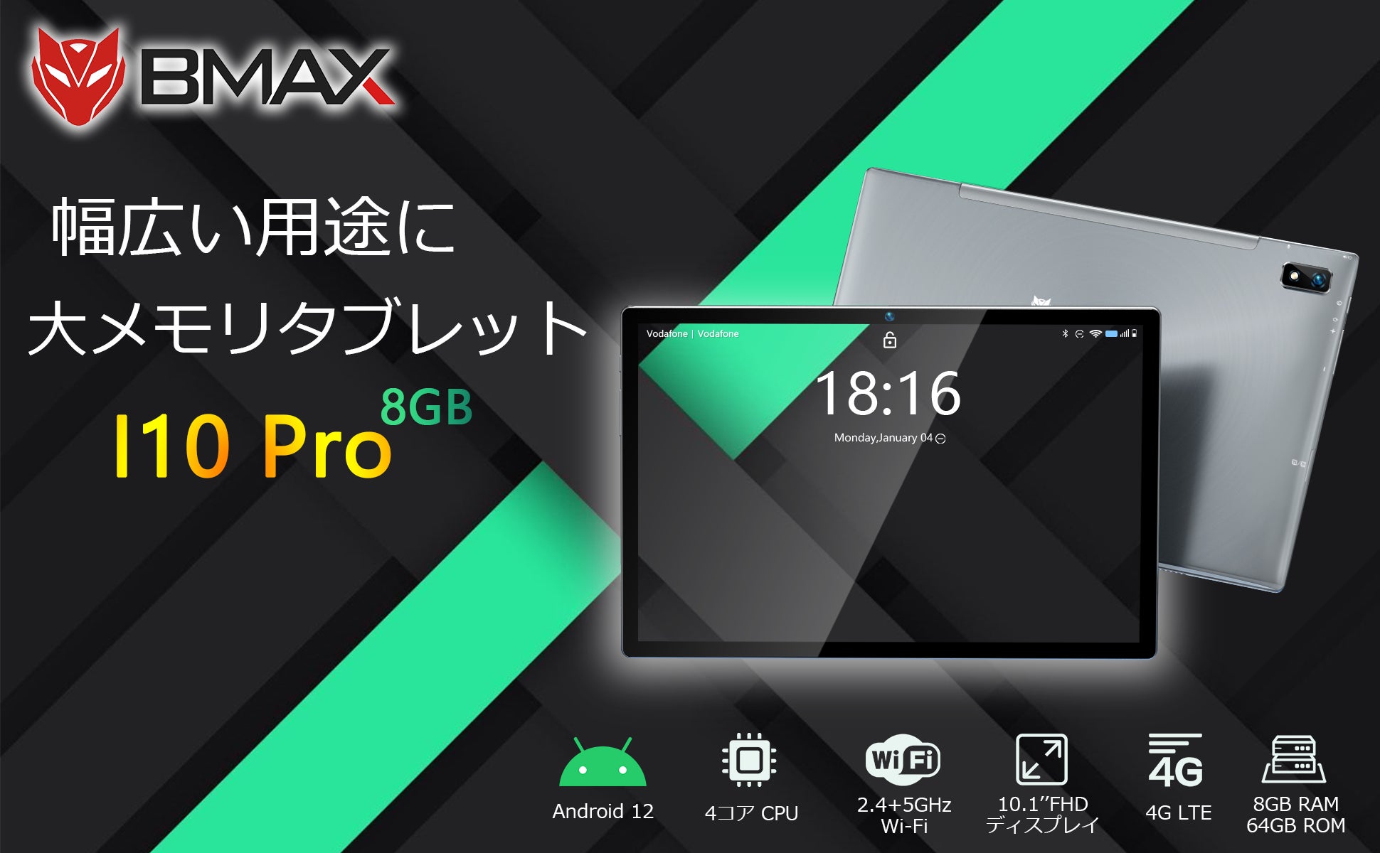 高性能4コアCPU、8GB(4+4拡張)+64GB+TF拡張可能。BMAX I10Pro タブレット10インチ wi-fiモデルは4GB の大容量RAMを用いて、さらにRAMを4GBを拡張できて、よりスムーズに操作できます。タブレット本体には64GBの高速ストレージを搭載し、アプリを素早くに起動してる同時に、ストレージ不足のストレスがなしに楽しめます。