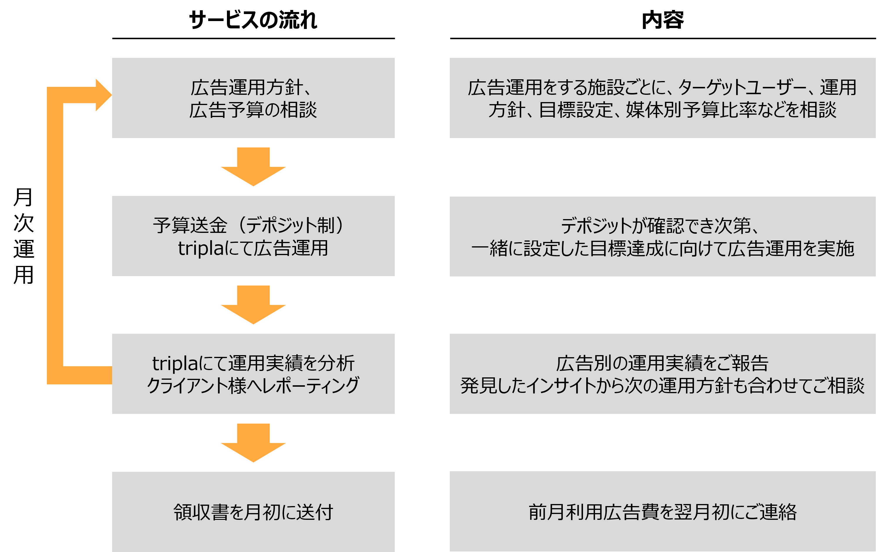 宿泊予約エンジン「tripla Book」を利用する宿泊施設向けに、Google、Yahoo!やInstagram、Facebookなどの広告掲載を中心としたweb広告運用を行います。施設ごとの要望に沿った広告プランを立案し運用、運用実績の分析と広告メニューの最適化までを一貫して実施。