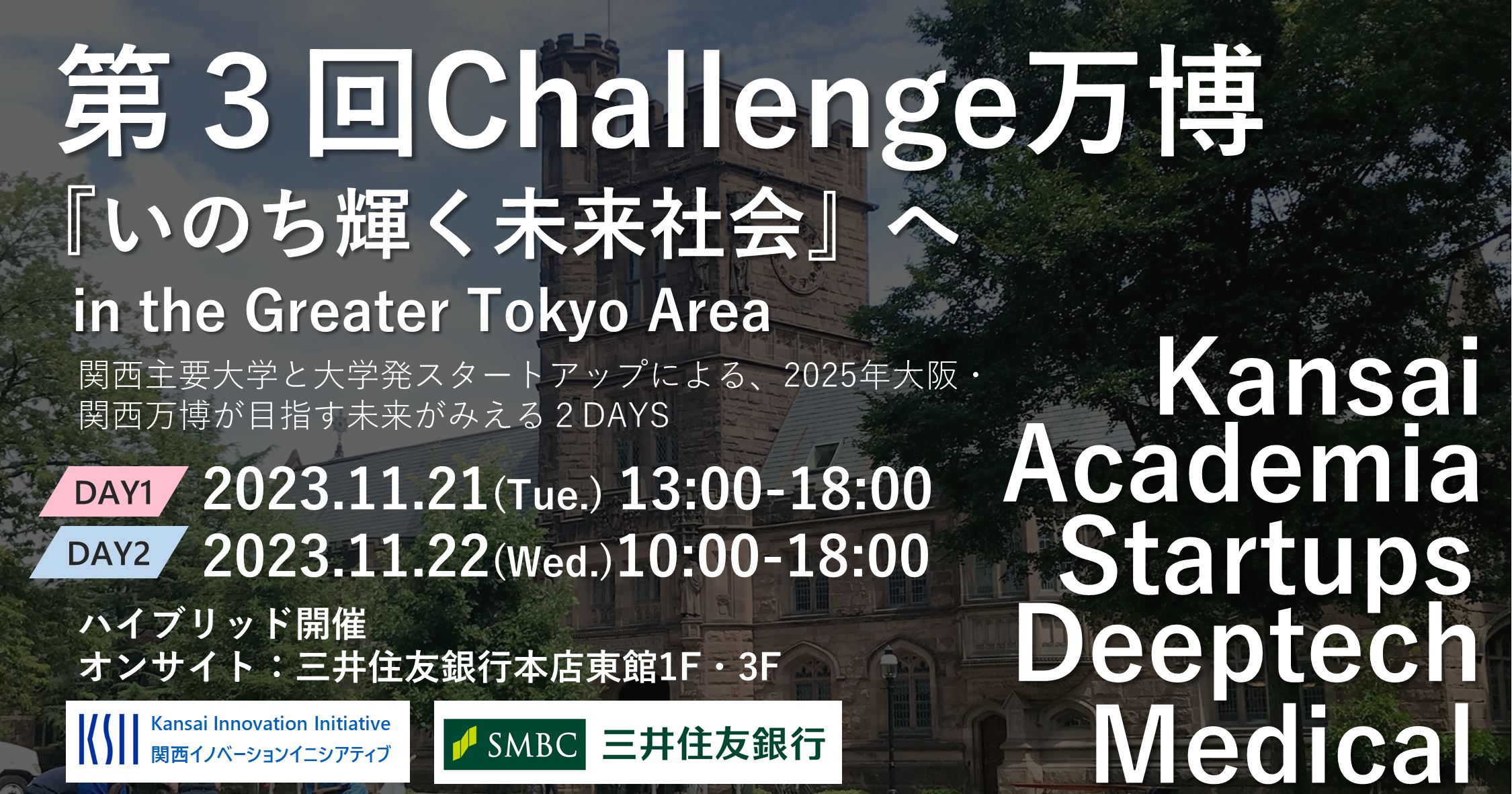 ・後援 :経済産業省 近畿経済産業局 公益社団法人関西経済連合会 一般社団法人関西経済同友会 大阪商工会議所 京都商工会議所 神戸商工会議所 東京商工会議所 公益財団法人大阪産業局 一般社団法人京都知恵産業創造の森 Greater Tokyo Innovation Ecosystem(GTIE) QUINTBRIDGE (NTT西日本) 一般社団法人うめきた未来イノベーション機構(U-FINO) 一般社団法人ライフ インテリジェンス コンソーシアム(LINC) 京都リサーチパーク株式会社 三井住友海上火災保険株式会社 住友生命保険相互会社 三井住友ファイナンス&リース株式会社