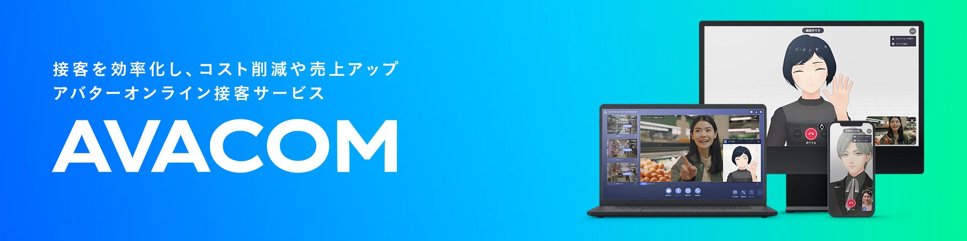 「AVACOM」は、アバターやChatGPTなどのAI技術によって接客を効率化するオンライン接客サービスです。マルチプラットフォームに対応しており、WEBサイト上でのオンライン接客による売上・契約増加や、問い合わせ効率の向上、店舗や受付の無人化・省人化、人手不足の解消に貢献します。