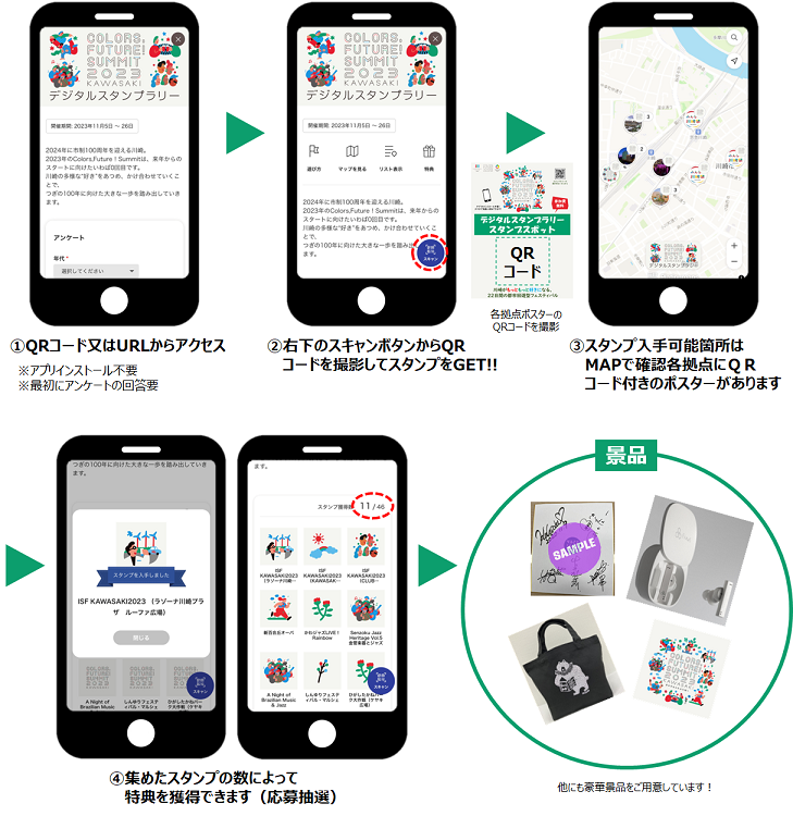 (3)特典内容:ワイヤレスイヤホン・サイン入りTシャツ・ユニフォーム・ハーバリウム・イベント金券等の賞品(応募抽選)、Colors,Future!Summit 2023 イラスト壁紙(ダウンロード)