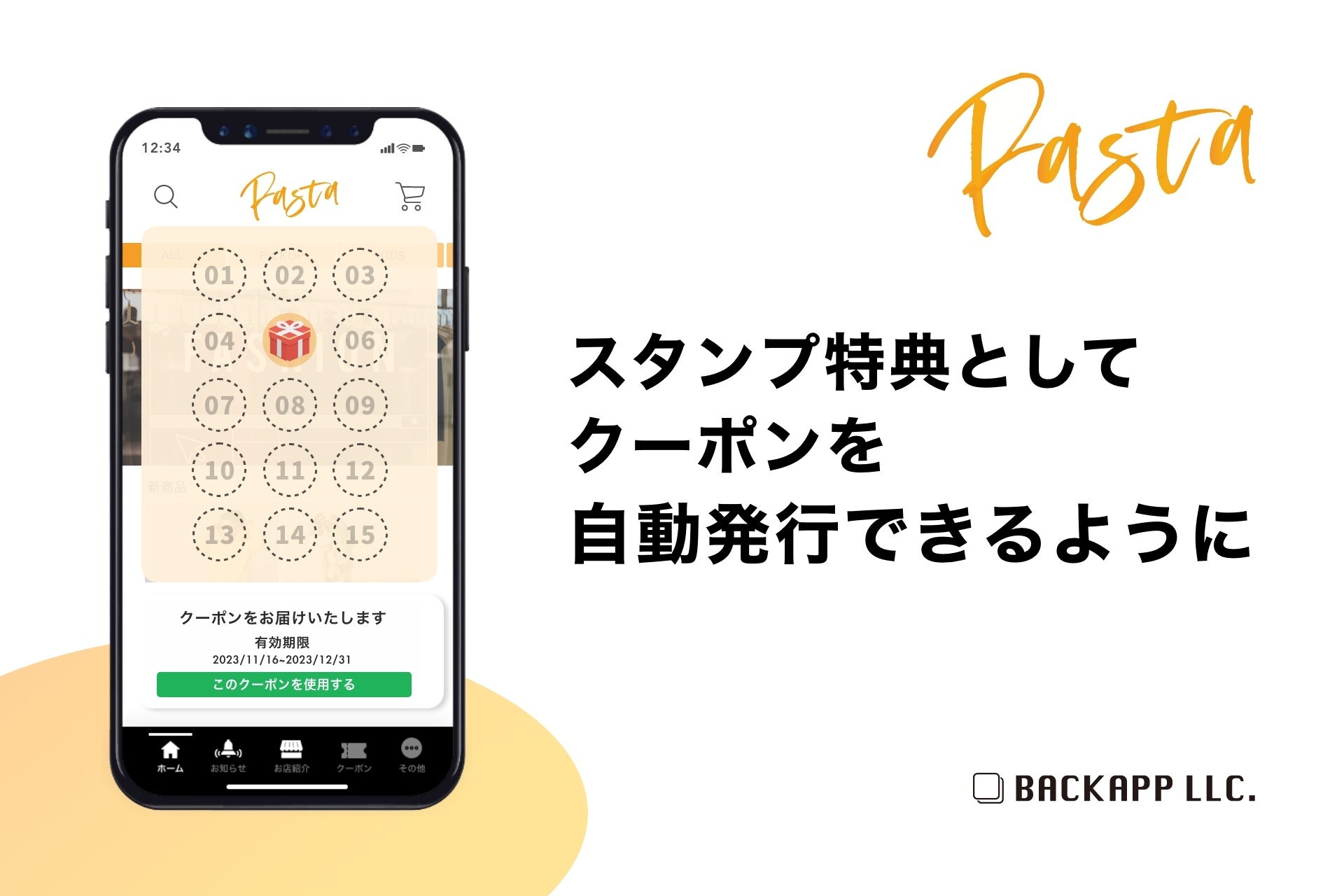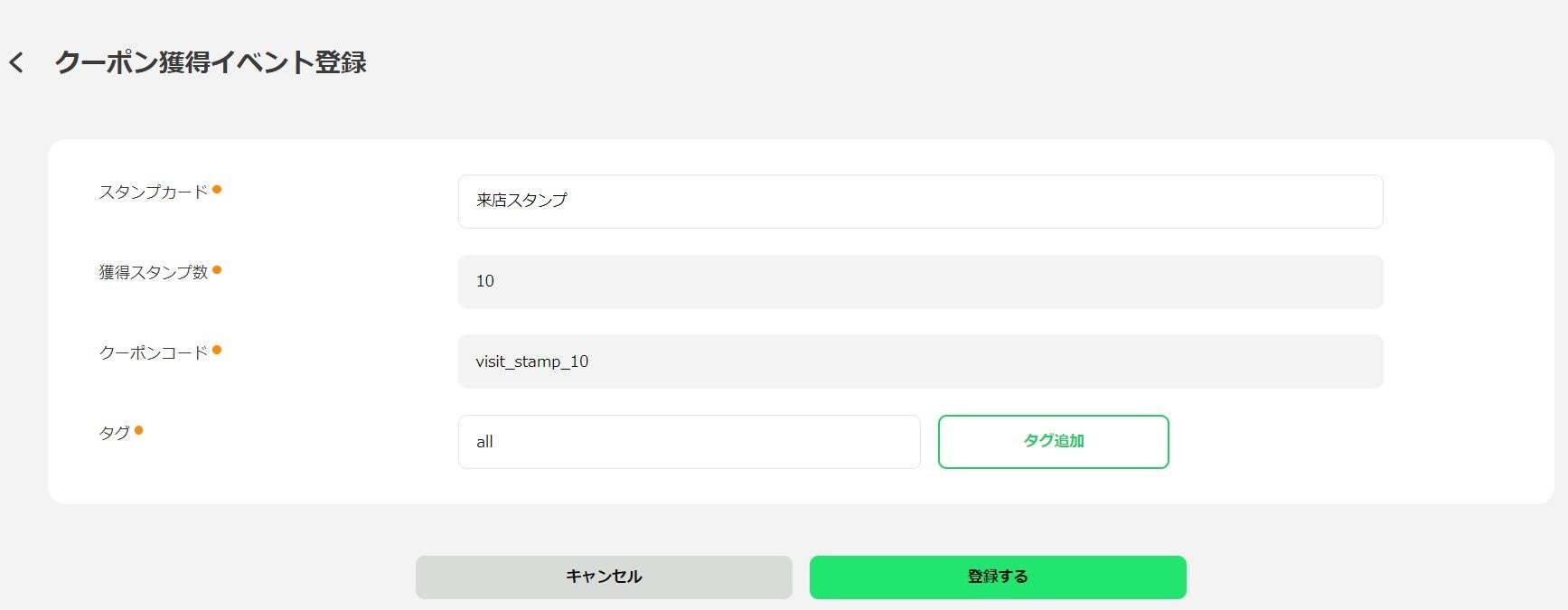 Pasta の「クーポン獲得イベント」機能では、管理画面にて「スタンプカード名」、「獲得スタンプ数」、「タグ(クーポンを配布するグループ)」を登録すると、クーポンが自動発行できます。