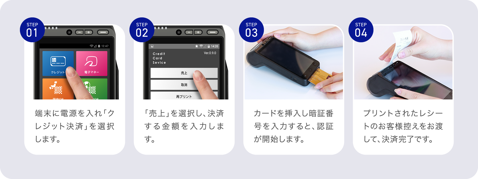 クレジットでのお支払いの場合には『簡単4STEP』でレシート発行まで完結し、決済の所要時間を最低限に抑えることが可能となります。