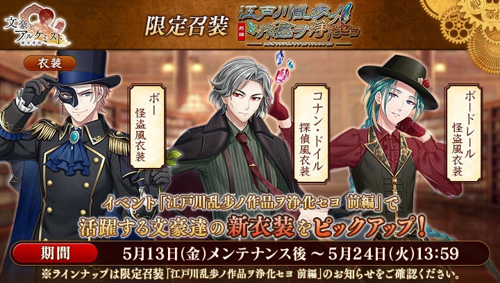 さらに、イベントと同時に開催される限定召装「江戸川乱歩ノ作品ヲ浄化セヨ 前編」にて新規追加された「ボードレール」「ポー」の〈怪盗風衣装〉、「コナン・ドイル」の〈探偵風衣装〉を編成すると、得点の獲得率がそれぞれ30%上昇します。