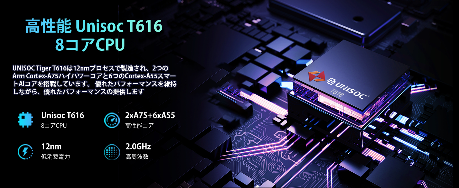 UNISOC T616は2つのArm Cortex-A75ハイパワ口アと6つのCor- tex-A55 インテリジエント AI コアを搭載しています。性能とエネルギー効率のより良いバランスを提供します。 先進的な12nm(ナノメートル)プロセスにより、電力効率とパフォーマンスを向上。 スムーズな操作感を提供します。
