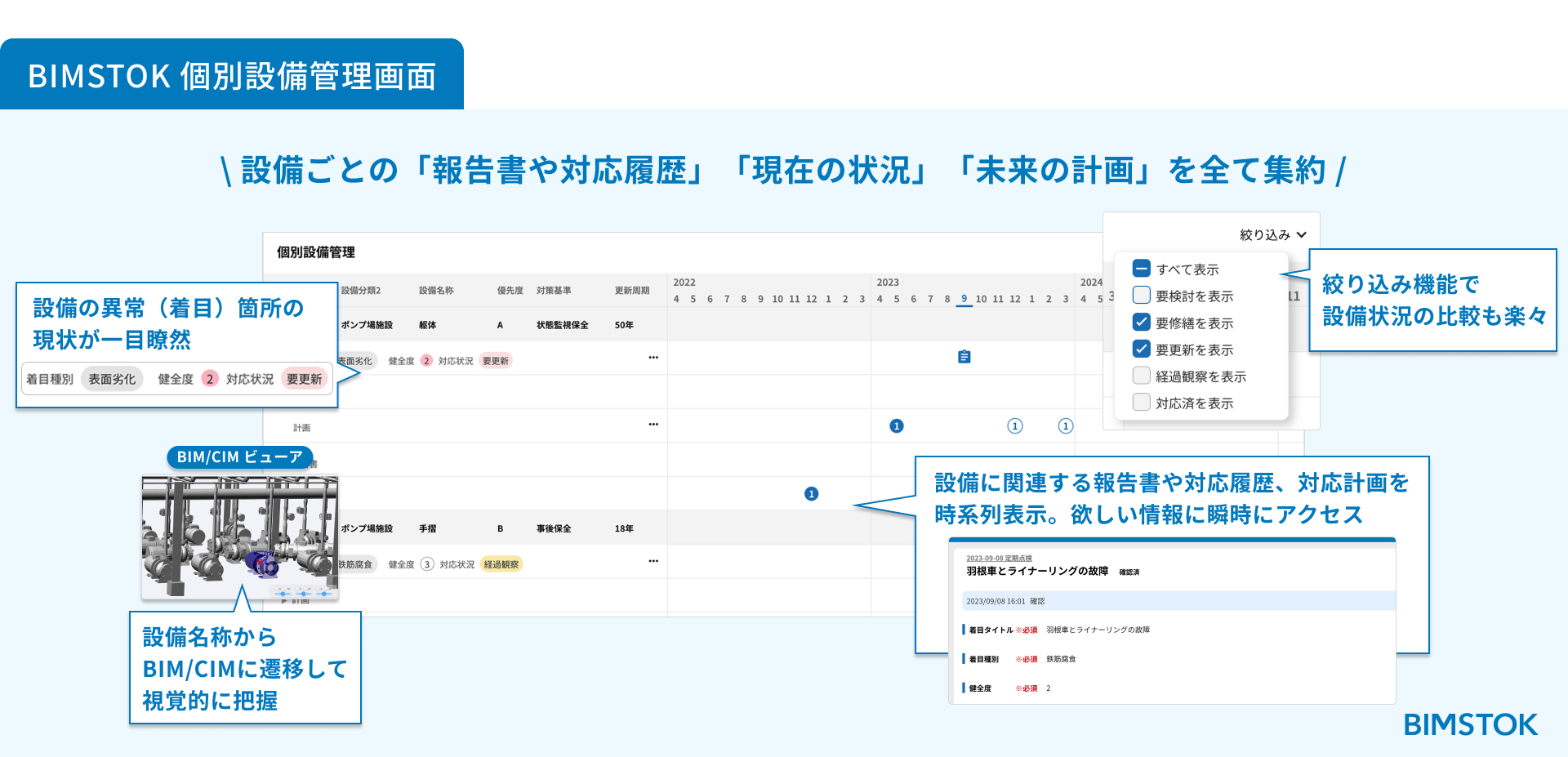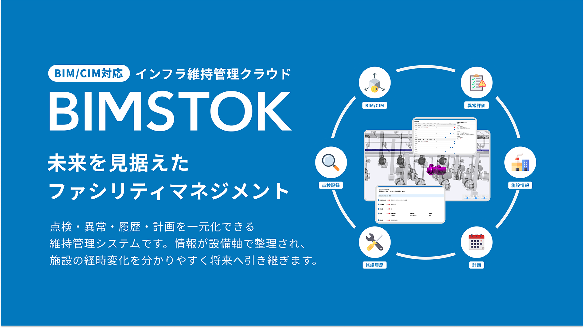 BIMSTOKは、BIM/CIMを活用し、維持管理情報を一元的に管理できる維持管理システムです。維持管理情報が設備ごとに時系列で整理され、必要な情報へ瞬時にアクセス可能。設備の経時変化を分かりやすく可視化し、施設管理者の意思決定を支援します。