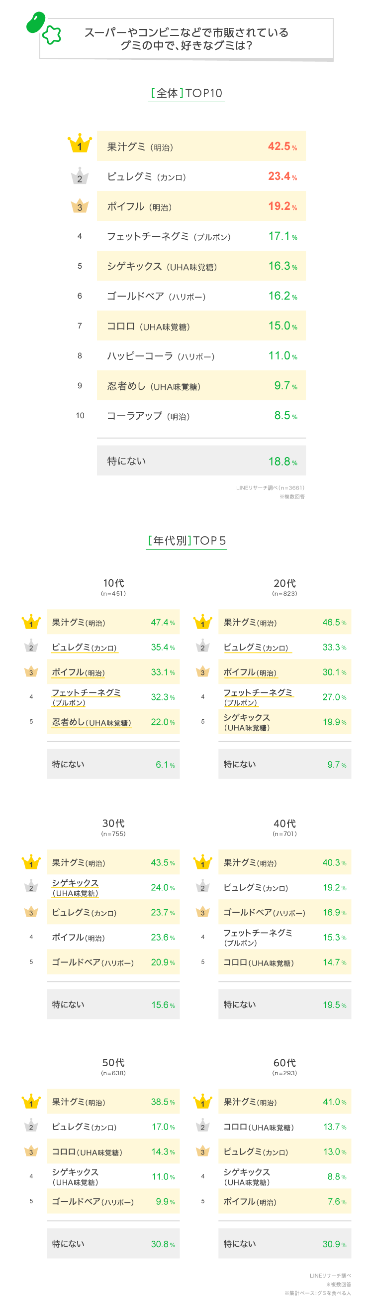全体では、「果汁グミ(明治)」が42.5%で、2位に大差をつけて1位に。2位は「ピュレグミ(カンロ)」が23.4%、3位以降は「ポイフル(明治)」「フェットチーネグミ(ブルボン)」「シゲキックス(UHA味覚糖)」が1割台後半で続きました。
