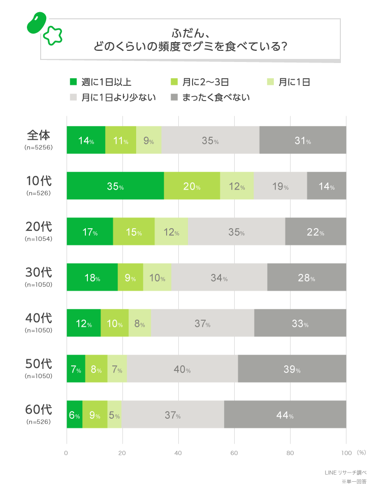 このたびLINEリサーチでは、日本全国の10代~60代までを対象に、グミを食べる頻度や、好きなグミについて調査しましたので、その結果をお知らせします。