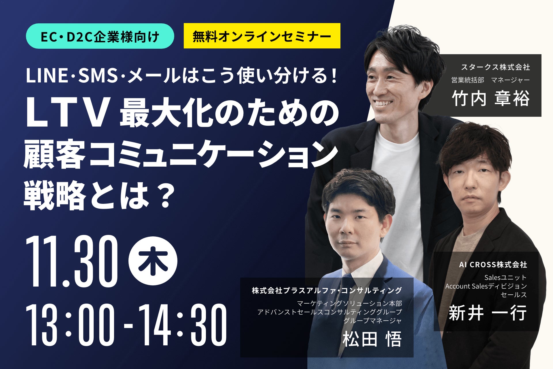 本セミナーでは「EC・D2CにおけるLTV最大化」というテーマで、EC・D2C業界における顧客コミュニケーションのトレンドや、LINE・SMS・メールの各チャネルの活用方法に関してご紹介いたします。各分野に精通した企業が収集した「生の声」を集めたウェビナーですので、LTV最大化のための改善策を模索されている方はぜひご参加ください。