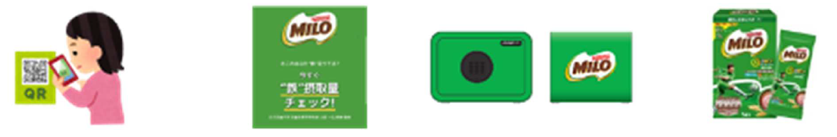 「ミロ 鉄分お助け テレキューブ」では、暑さで汗をかくことによるミネラルの流出に加え、ミネラルのひとつである“鉄”の摂取源である肉、魚、野菜などの摂取不足により食事・栄養バランスが偏りがちな夏における“鉄”摂取の重要性を啓発します。ブース内に掲示されている専用QRコードをお手持ちのスマホ等で読み込み『“鉄”摂取量チェック』を行うことで、1日あたりの“鉄”の平均摂取量を知ることができ、“鉄”摂取を自分ごと化することができます。なお、『“鉄”摂取量チェック』を最後まで実施した方は、「ネスレ ミロ オリジナル スティック」1箱をお持ち帰りいただけます。
