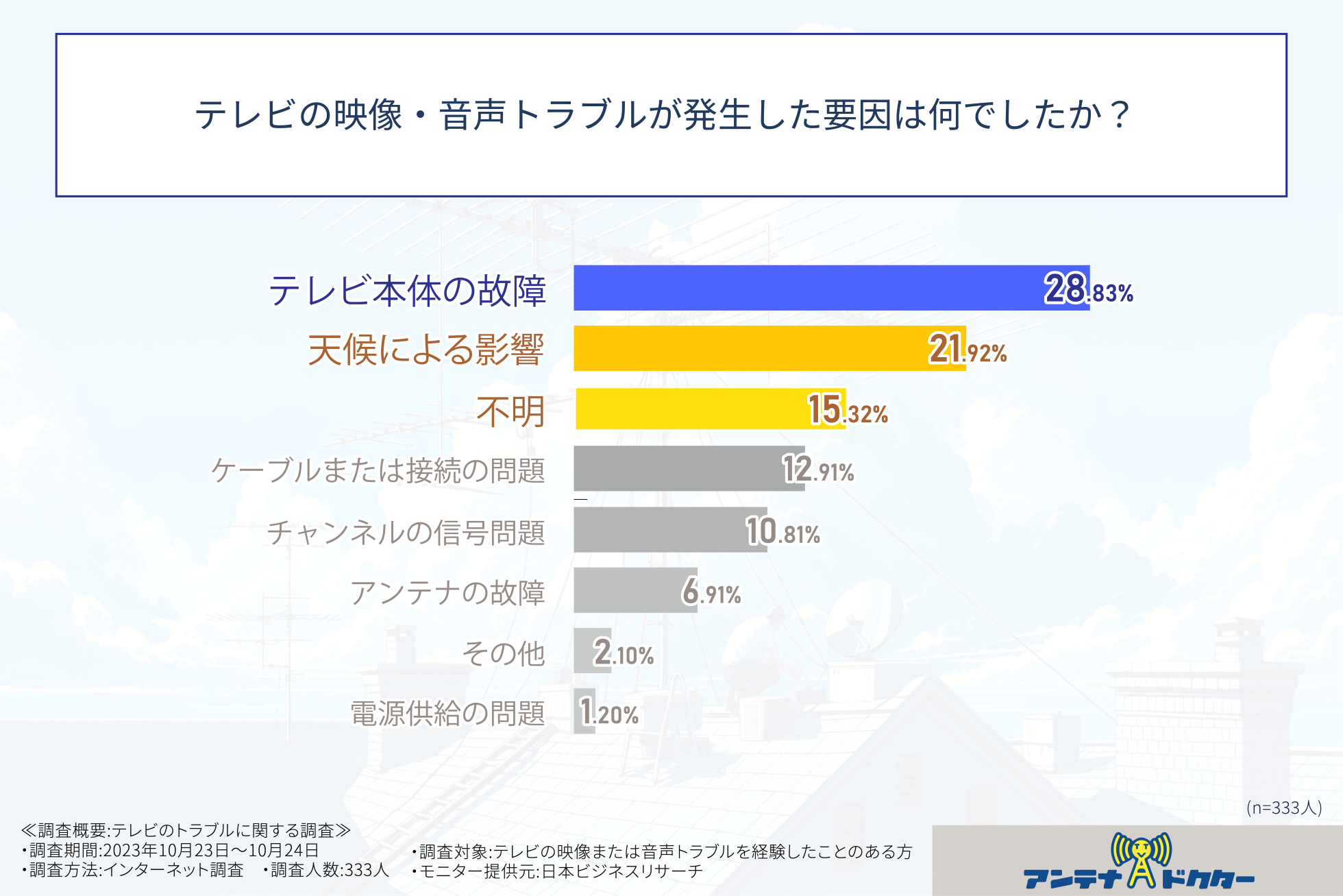 その中で最も回答を集めたのは、「テレビ本体の故障:28.83%」、次いで「天候による影響:21.92%」、「不明:15.32%」という結果となりました。