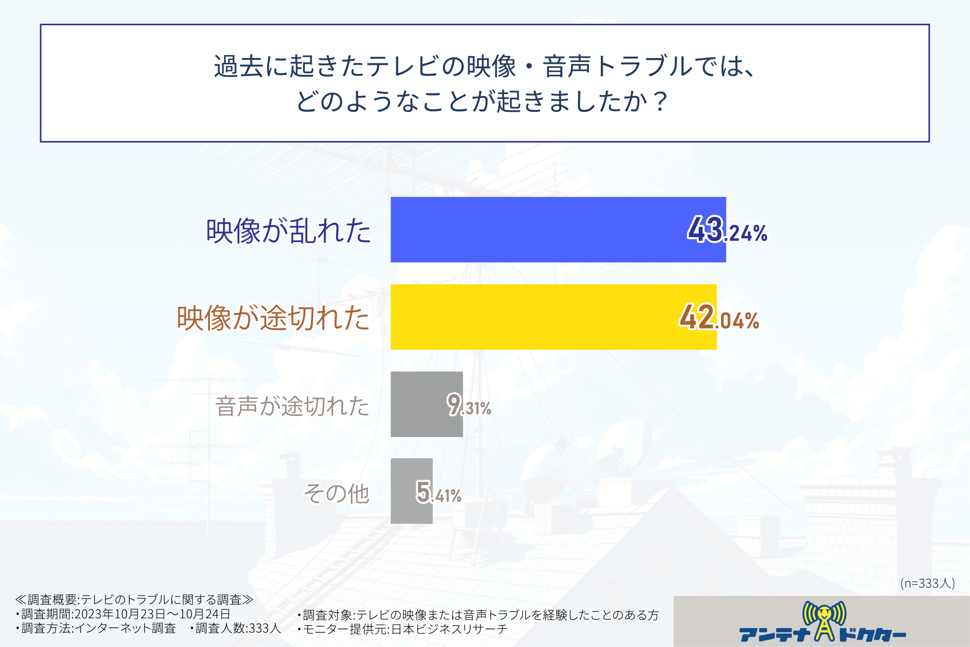 この調査で最も回答を集めたのは、「映像が乱れた:43.24%」、次に「映像が途切れた:42.04%」、「音声が途切れた:9.31%」という結果でした。