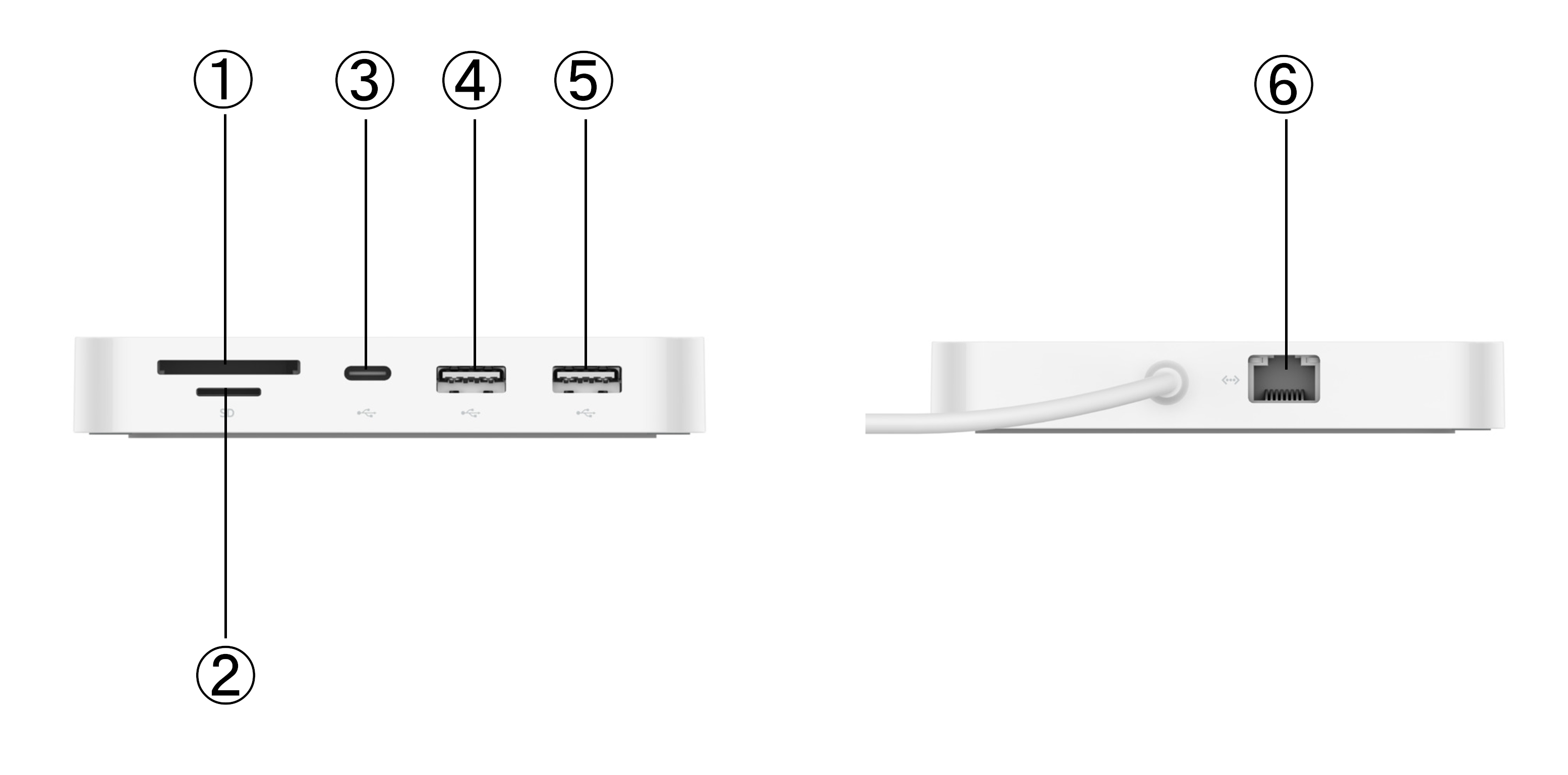 本製品は6つの拡張ポートを搭載し、iMacやPCの背面に取り付け可能で簡単に周辺機器や有線イーサネットポートを使用可能なUSB-Cポートです。SDカードリーダー、microSDカードスロット、USB-Cポート、USB-Aポート2口、ギガビットイーサネットの5種類のポートを拡張することができ、最大10 Gbpsのデータ転送が可能です。