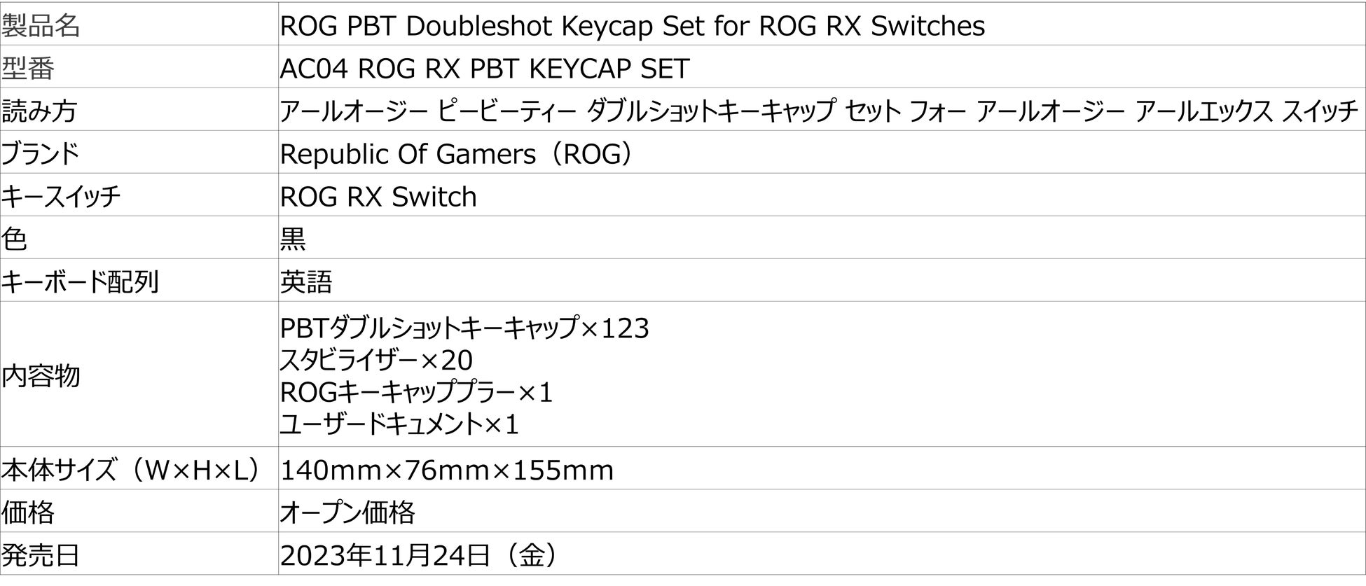 ROG PBT Doubleshot Keycap Set for ROG RX Switches | Keyboards | ROG 日本The ROG PBT Doubleshot Keycap Set for ROG RX Switches offers gamers premium, durable PBT keycaps for ROG RX Optical Mechanical Switches, providing longer lifesp...