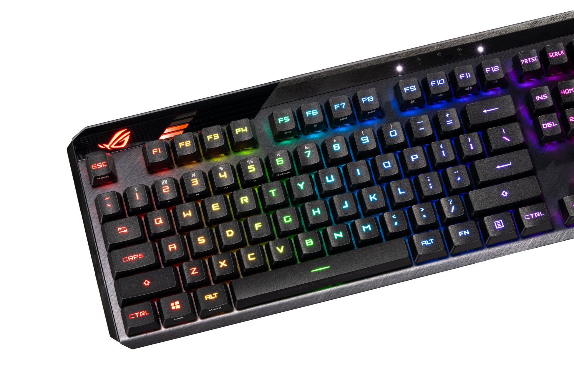 ・成型キャップに施されたROGの刻印にイルミネーションが透けて見え、耐久性を最大限に高めるダブルショット成形を採用