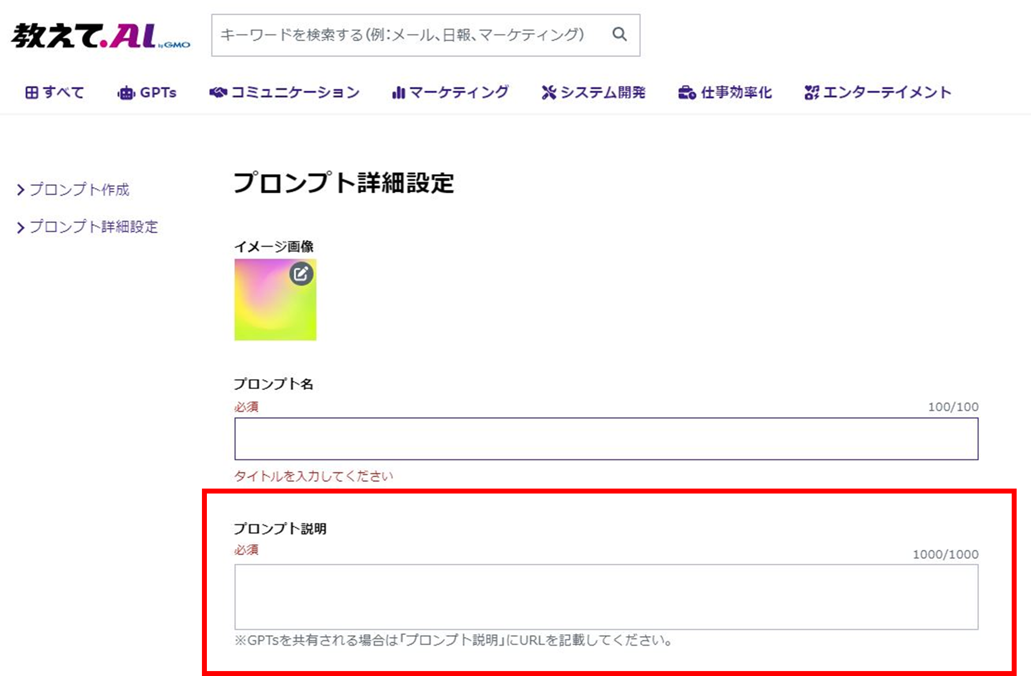 「GPTs」を共有する場合は、【プロンプト作成】ボタンから作成画面を進んでいただき、プロンプト詳細設定の「プロンプト説明」欄(赤枠)に「GPTs」のURLを記載いただくことで投稿することができます。プロンプト投稿と同様にカテゴリを選択していただくことで、検索者が「GPTs」を見つけやすくなります。