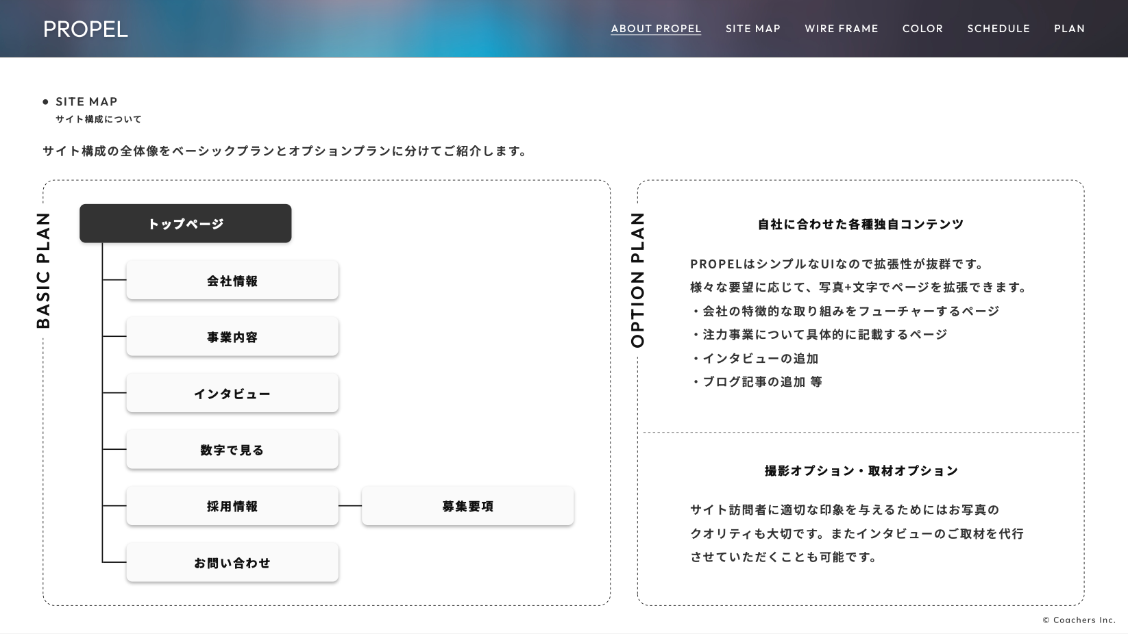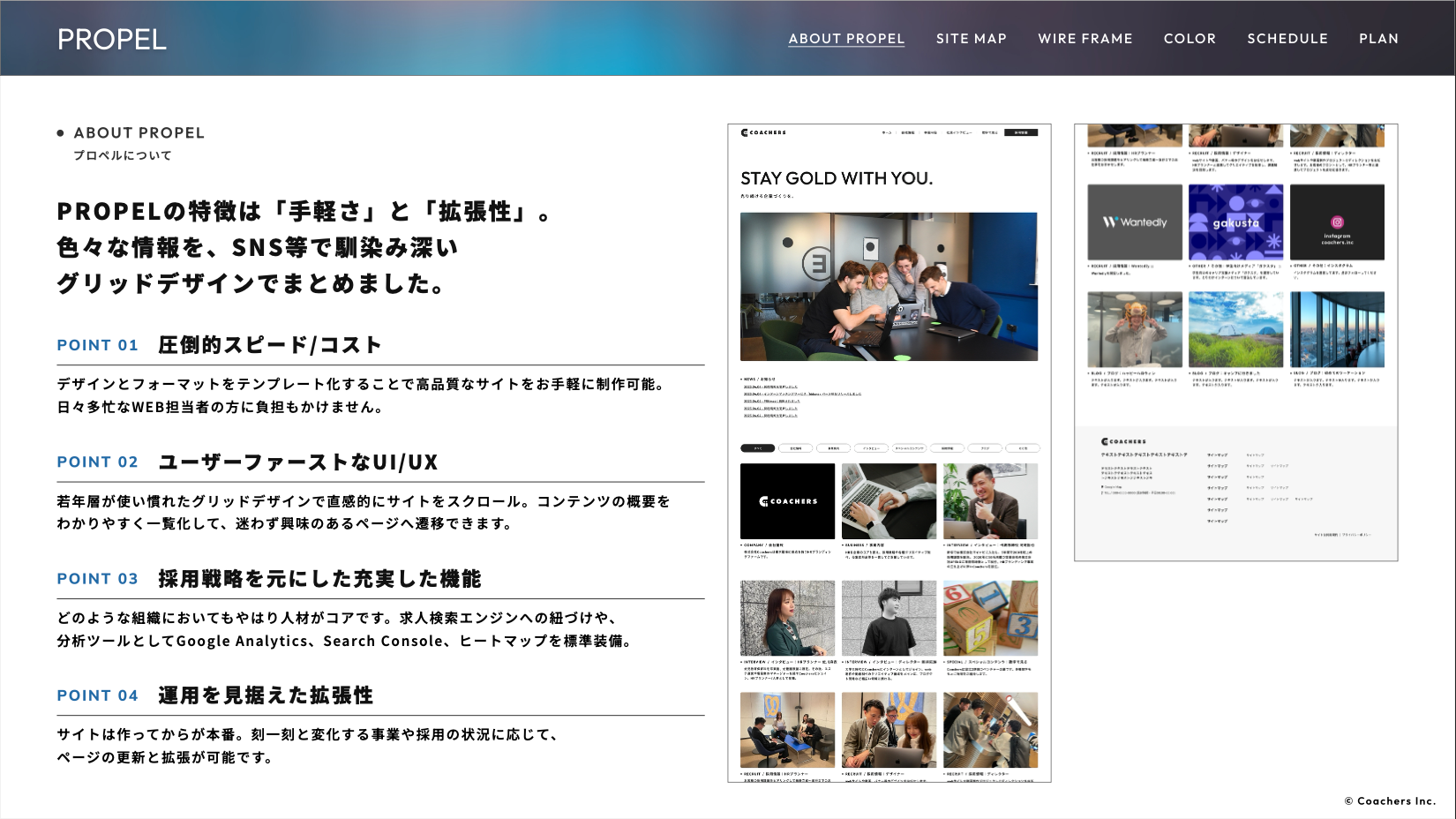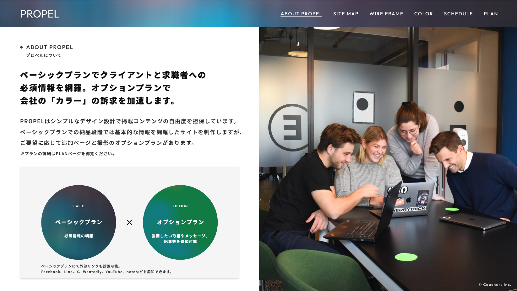 『propel』は弊社がHRブランディング事業として培った採用ノウハウ・データを集約した「最適な採用ホームページ」の型をテンプレート化しており、低コスト・短期間で理想とするWEBサイトを制作できるサービスを実現しております。