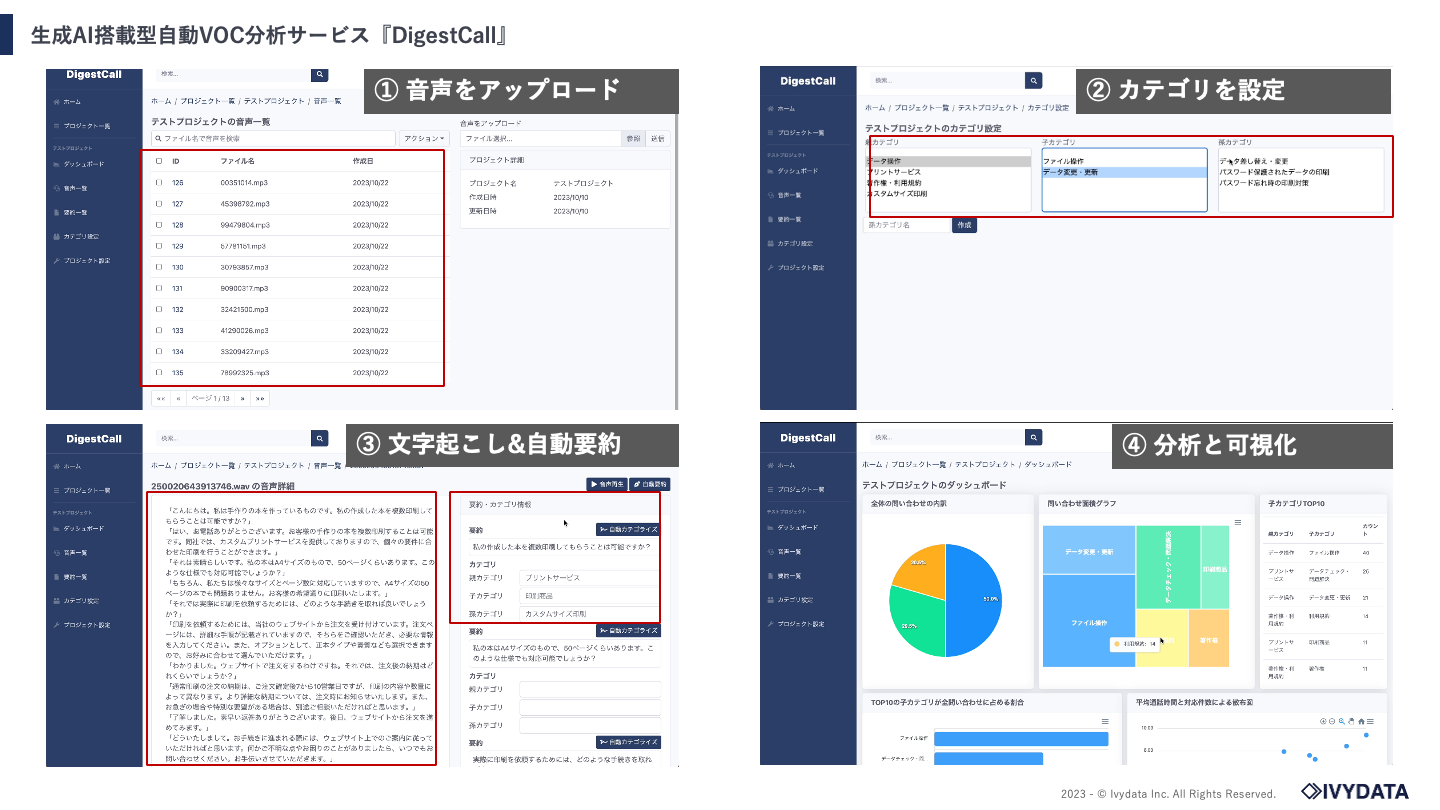 『DigestCall』は企業に寄せられる電話音声データをAIが自動で分析し、問い合わせの傾向やコールリーズンを可視化するサービスです。コールセンターに蓄積された音声データをアップロードしていただくだけで、音声認識AIがテキスト化し、ChatGPT搭載型の分析エンジンが問い合わせ内容を要約し、カテゴライズします。分析結果はダッシュボードにグラフとして表示され、最新の問い合わせ状況を迅速に把握することができます。