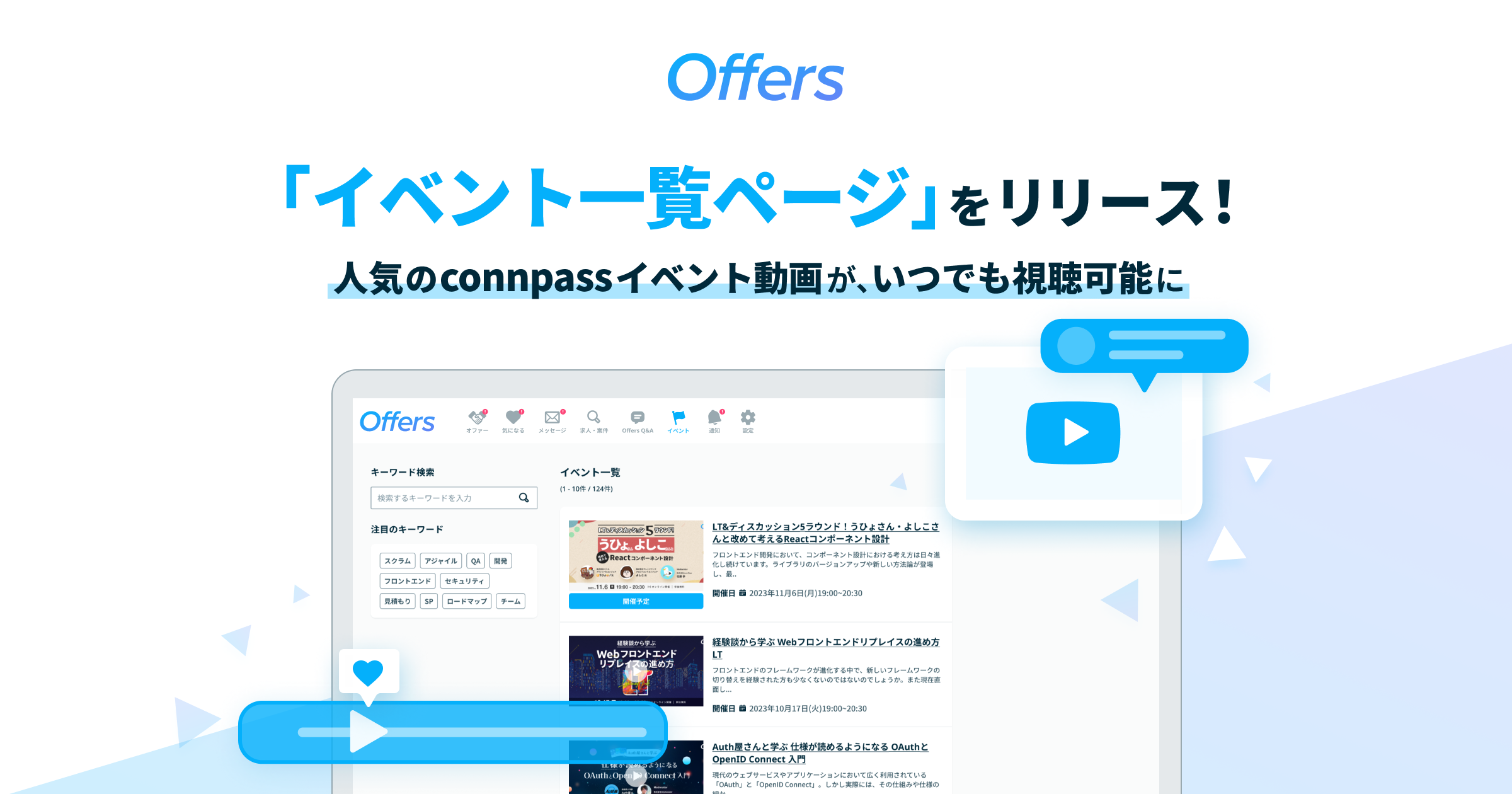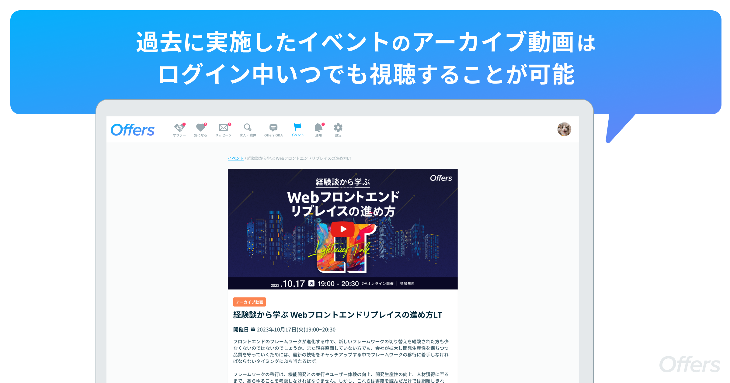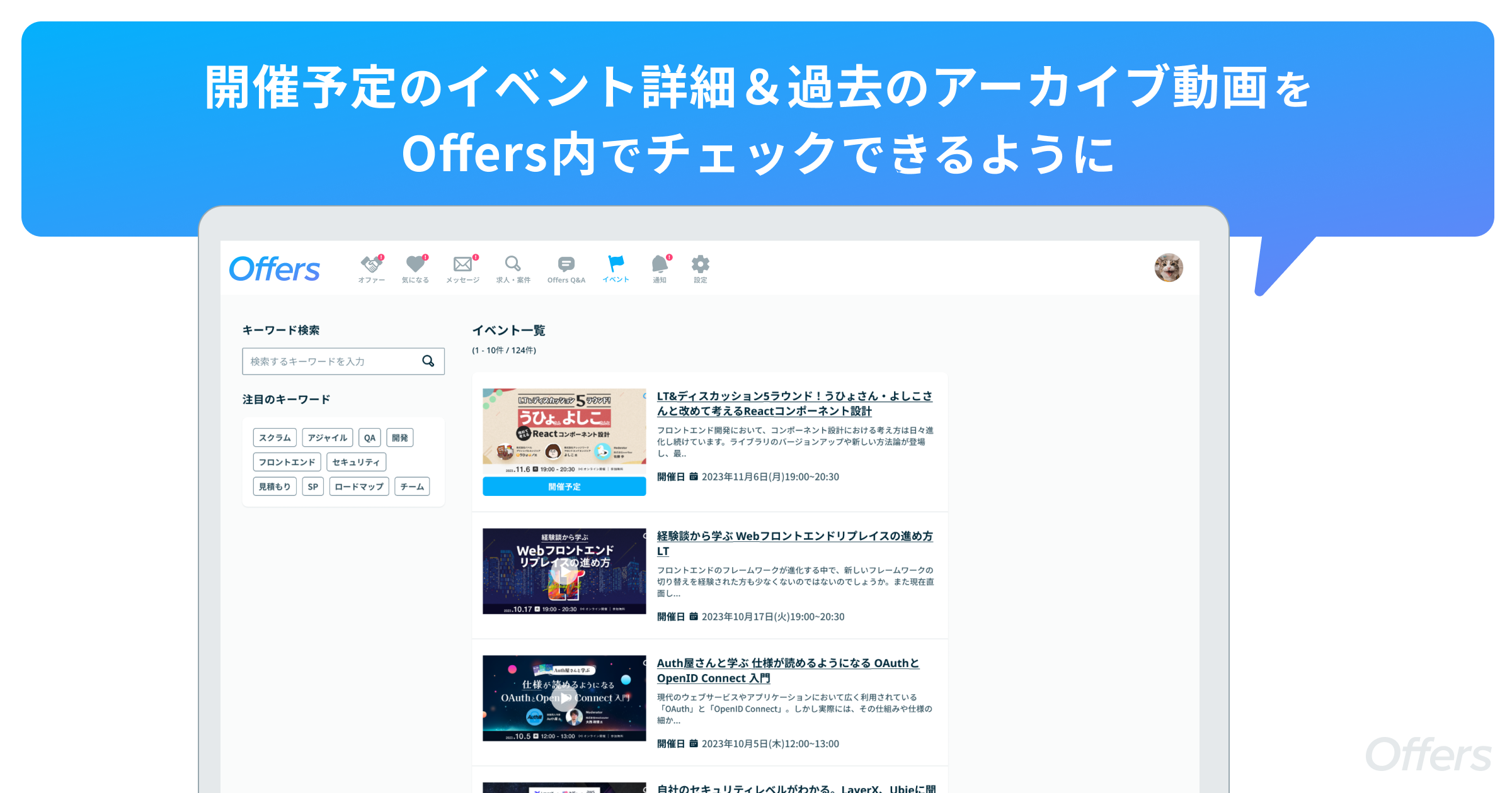 Offersでは、エンジニア、PM、デザイナーと一緒に開発現場の疑問を紐解くことを目的としたイベントを開催しています。2023年から本格的にイベントチームを設立し、本日に至るまで計30回以上のイベントを開催してまいりました。その中で、1回のイベントで800名を超える皆様に参加いただくなど多くの反響をいただいた反面、見れなかったのでいつでもみれるようにして欲しいという要望をいただいており、本リリースするに至りました。