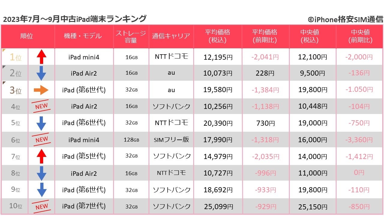 iPad全体の取引数は、前回の調査から30.3%の減少が見られ、iPad Air2・iPad(第6世代)・iPad(第5世代)・iPad mini 4の4機種を中心に取引されました。前回の調査では、8年前に発売されたiPad Air2(au)が12倍もの取引数の伸びを見せ、1位に急浮上しましたが、今回の調査では、iPad mini 4(NTTドコモ)が前回調査の8倍の取引数で急伸し、1位となりました。この背景には、前回1位だったiPad Air2(au)のキャンペーン終了による取引数の大幅減少が影響していると考えられます。加えて、iPad mini 4(NTTドコモ)の平均価格が前回の調査時より2,400円値下がりの12,195円・中央値12,100円と価格下落が取引数増加に繋がったと言えるでしょう。