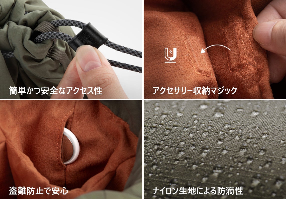 OneGoシリーズから新たに登場したクラウドバッグとドローストリングバッグは、デザイン性と使いやすさを兼ね備えています。その日の気分や荷物に応じてハンドバッグ、ショルダーバッグ、パッキングキューブ、カメラストラップ、4つのスタイルで使用できます。バッグ内部には AirTag隠しポケットを備えて盗難を防止でき、厚手のパッドでカメラや大事な荷物を安全に保護します。