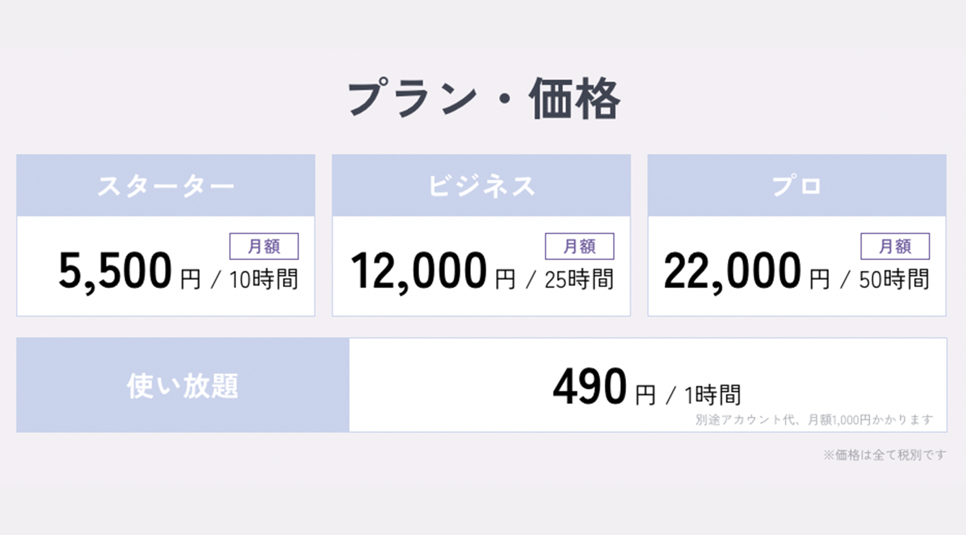 ・使い放題 490円/1時間 ※別途アカウント代月額1,000円