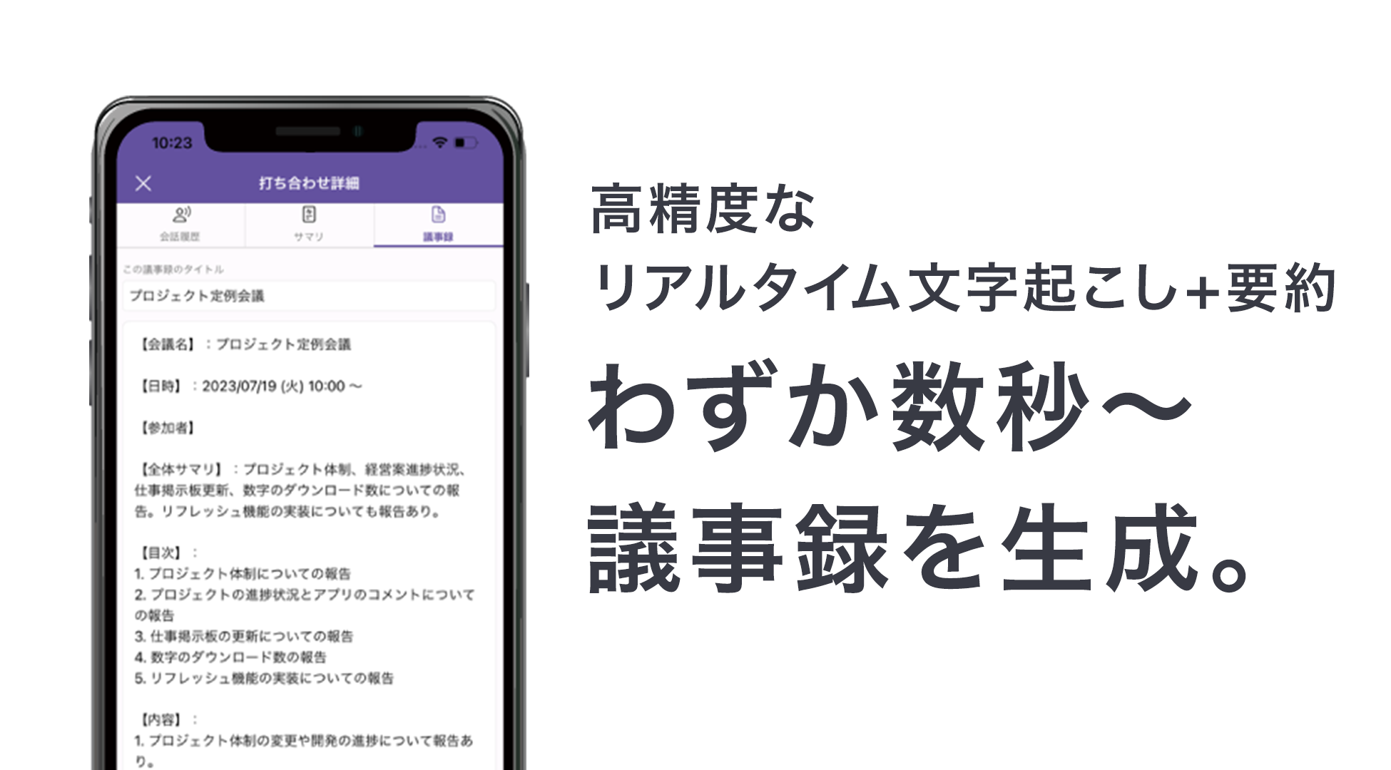 また、開発チームには長年生成AIを専門としているエンジニアが在籍。文字起こしにもAIを利用することで精度を高め、議事録の内容については要約・目次・内容・ToDo・次回ミーティングについて等必須項目を網羅。自動生成であってもビジネス現場で即戦力として利用できるレベルにまで仕上げました。