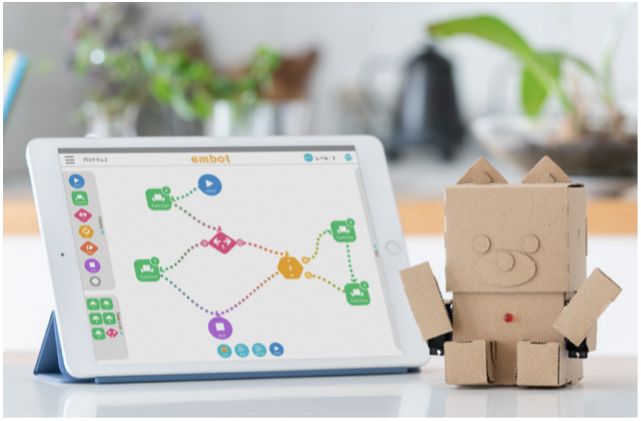 embot(エムボット)はダンボールと電子工作パーツを用いてロボットを組み立てることで、電子工作やものづくりの基礎を学ぶことができます。