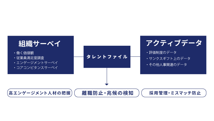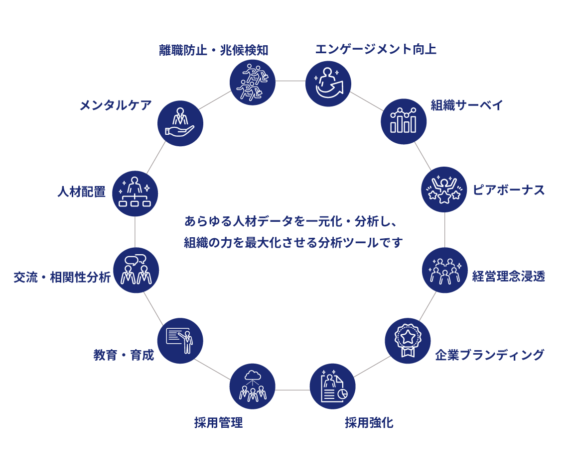 組織サーベイ、コミュニケーションデータなどのあらゆる「人材データを一元化・分析」組織の力を最大化させるシステムです。
