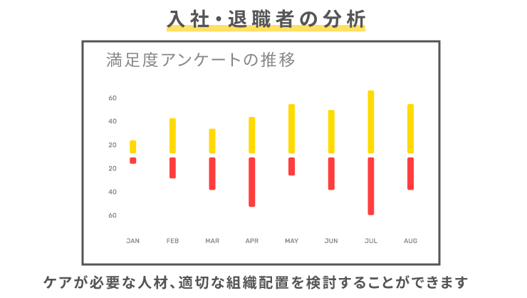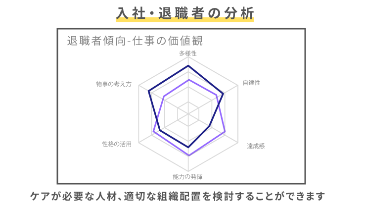 属性、在籍期間、退職理由、各種サーベイの結果を基に傾向を可視化することができます。